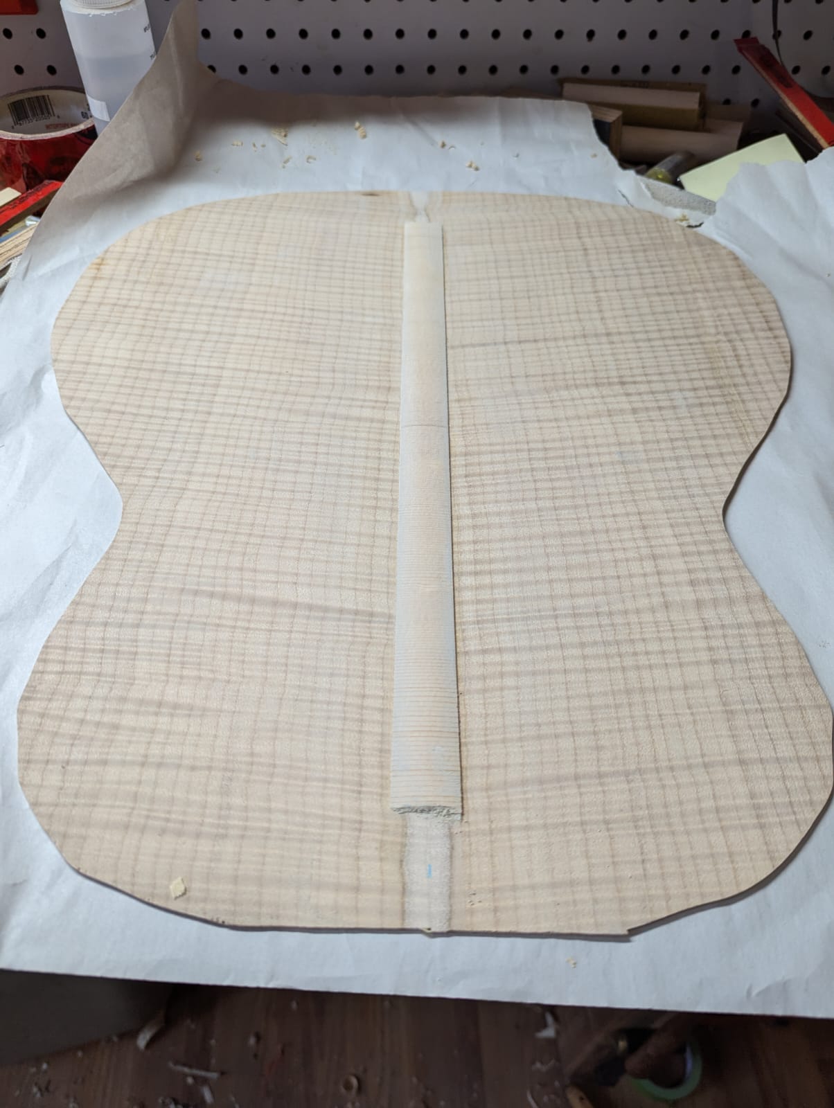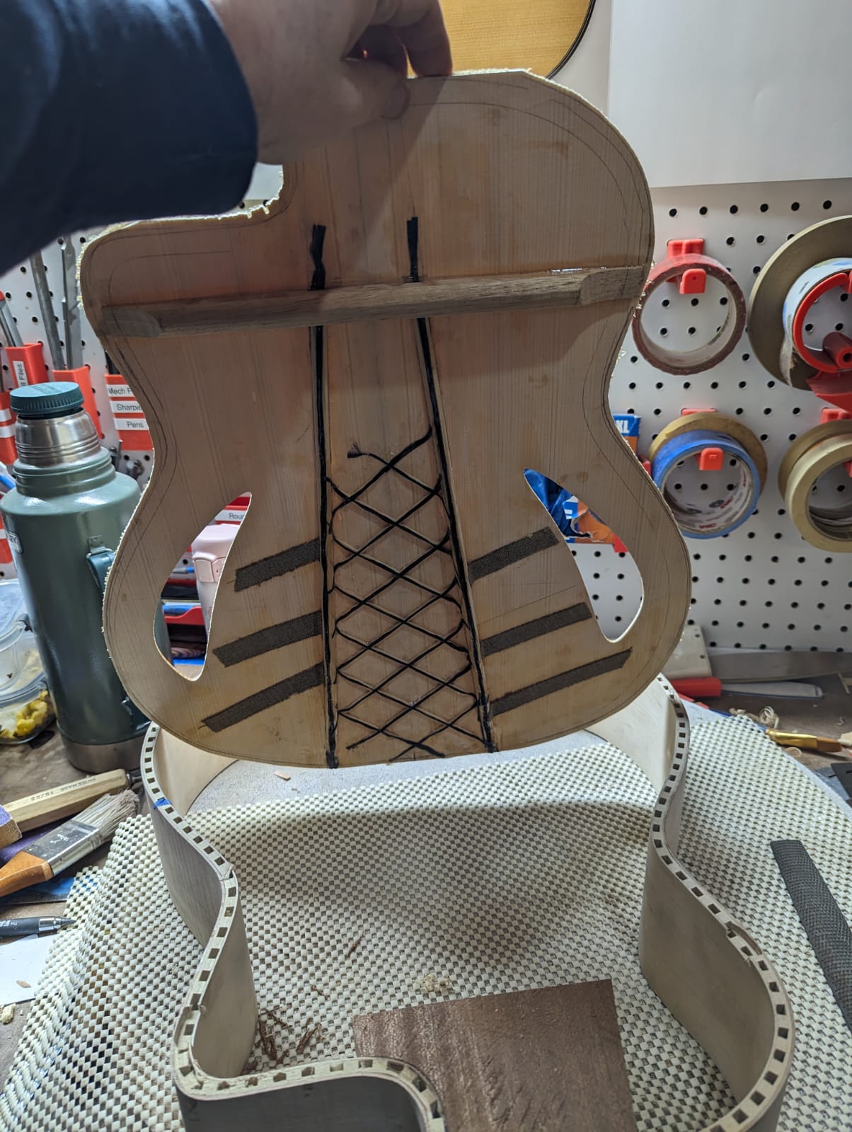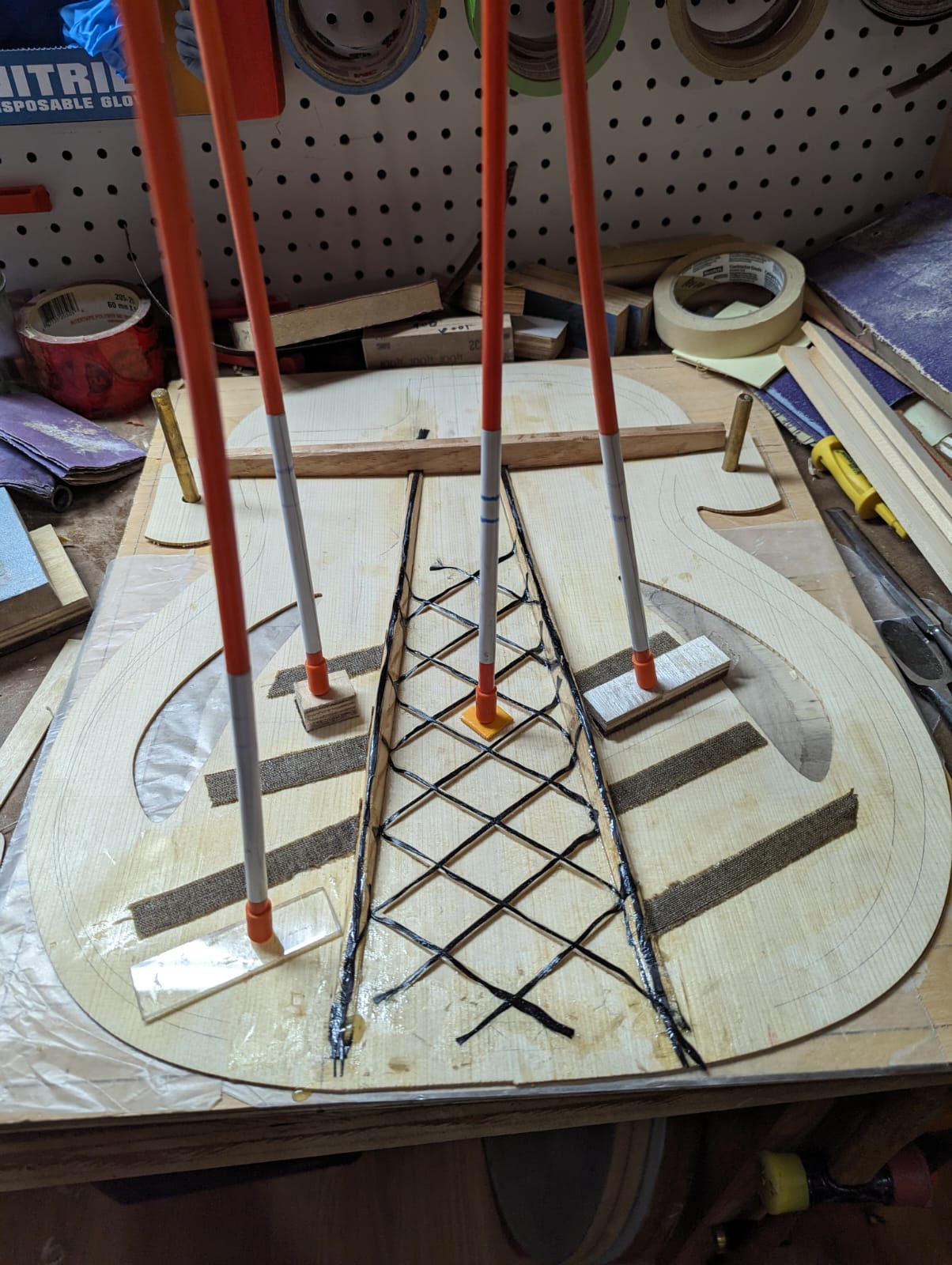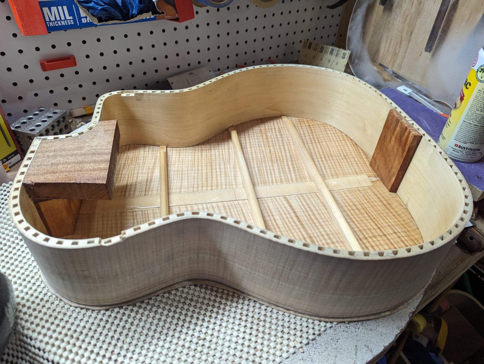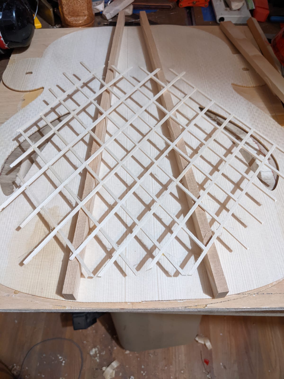 1) Maple/Spruce guitar that's a mashup of a Selmer body shape with D'Aquisto Centura style sound holes and visual style. Because of the sound holes I went with vertical bracing like an archtop. There's a carbon fiber/spruce lattice reinforcement in between the bars to maintain the arch. This guitar is a total experiment but something I've had in my mind for a number of years for some reason. No idea how it will sound, I'm hoping at least that it sounds like "a guitar" and I assume it will.