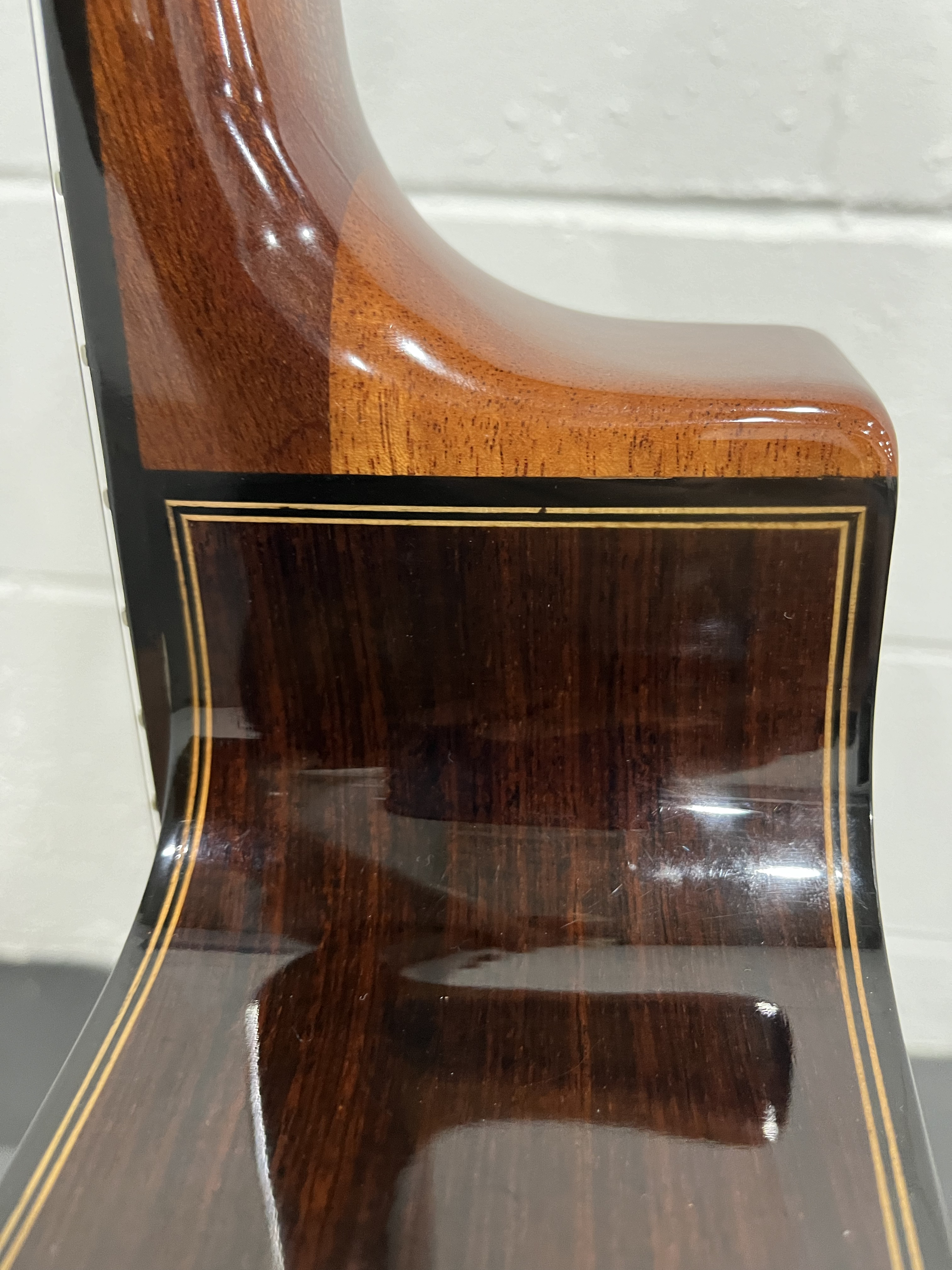 Looking to sell my Vintage Strings Manouche Moreno Modele Jazz oval hole guitar (serial number MNA-082) w/Hiscox hard shell case and Peche a La Mouche magnetic pickup. I’ve had this guitar since about 2011. I think I picked it up from someone on the forum, but maybe not. The guitar is in excellent shape. The one issue is the tuner button for the D string. It’s cracked, and has been for years, on one side (see pic). I put superglue in the cracks when it first happened, and they haven’t gotten worse.