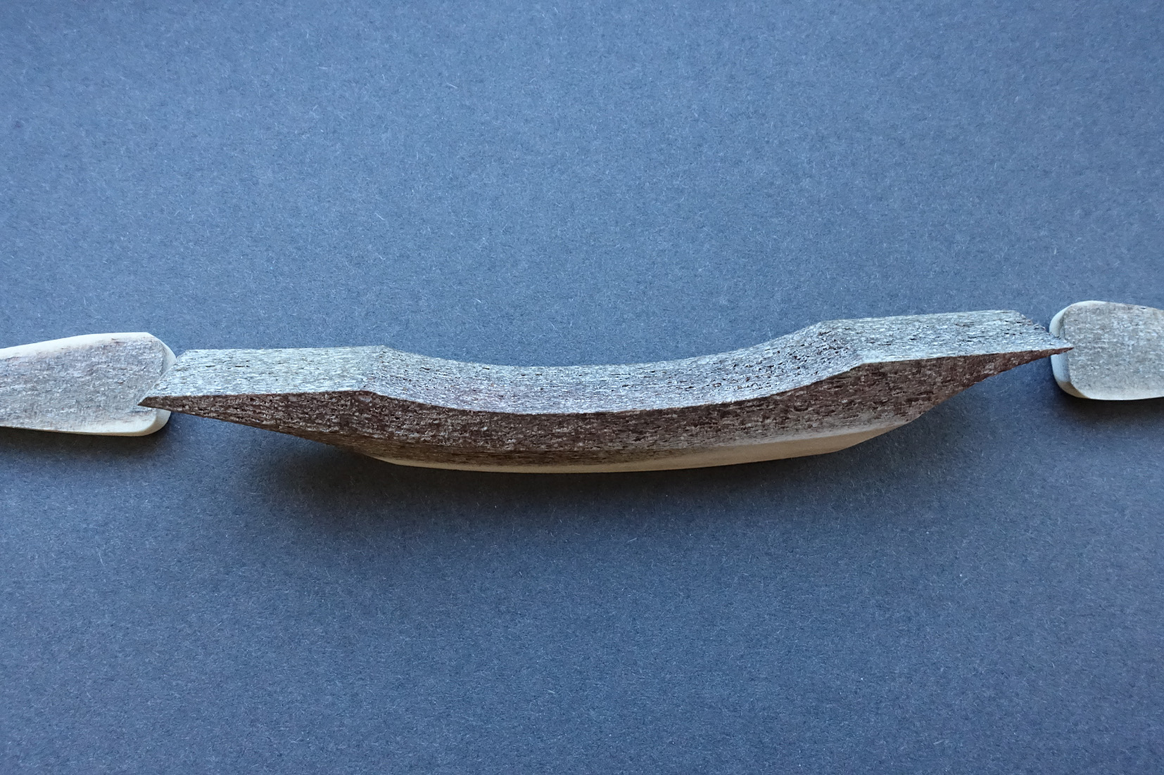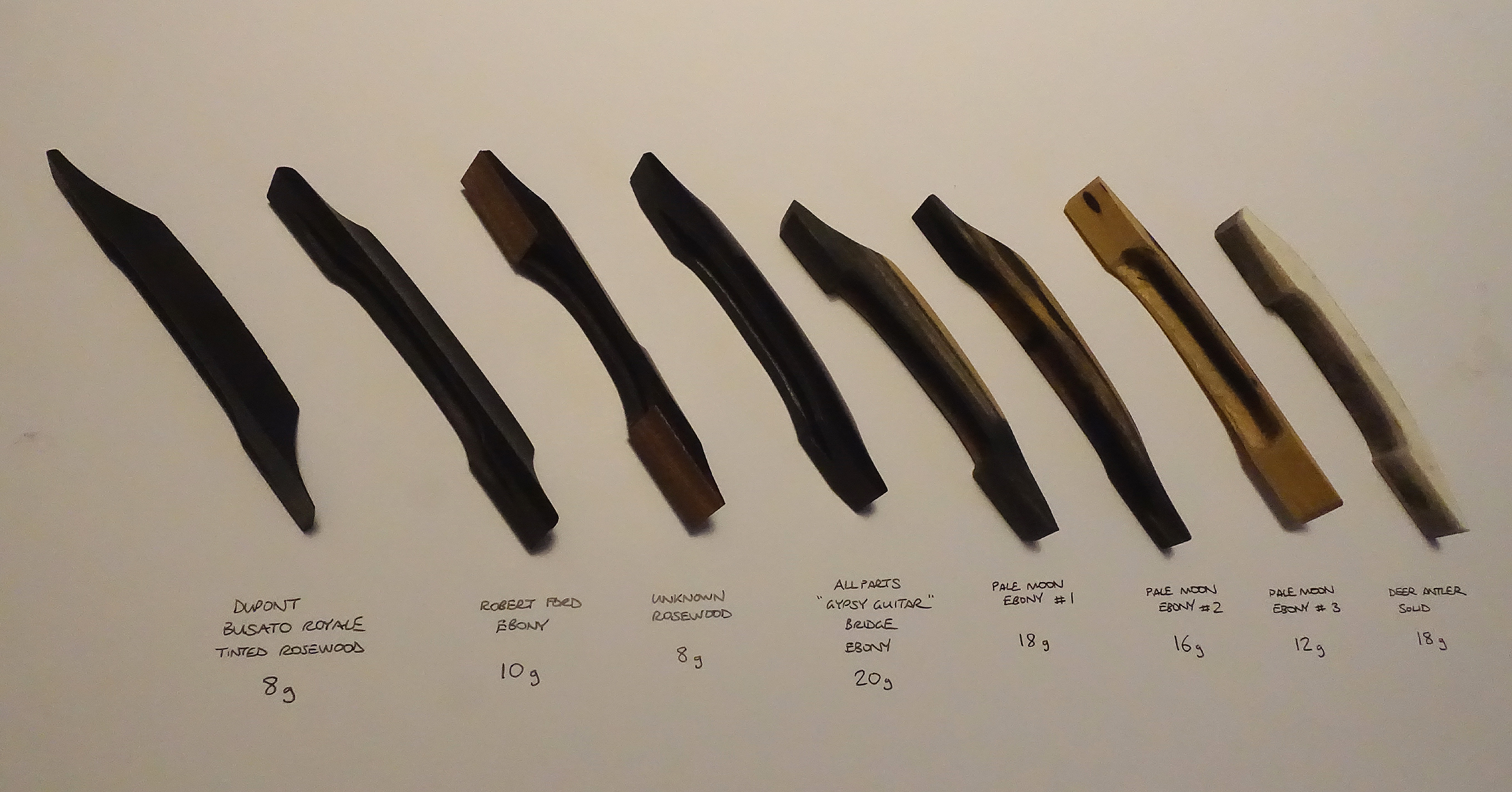 Here are some pics of the bridges. Since taking the group shot with the weights, I've made another lighter antler bridge at only 12 grams. I've tested it, plus the lightest pale moon ebony bridge (12g) and a pine bridge with an ebony top (10g). The test guitar is my recently refinished Gallato which needed a new bridge anyway. The pine was not good - thin sound all round, slightly banjo. The antler was pretty good - quite a full sound and loud, quite trebly. The best of the three was the ebony which is staying on - as loud as the antler, but with a more refined, sweeter tone and strong trebles and mids. The antler could be good for a guitar that is a little on the dull side. It'll go on a guitar for sure - as much a statement and talking point as anything!