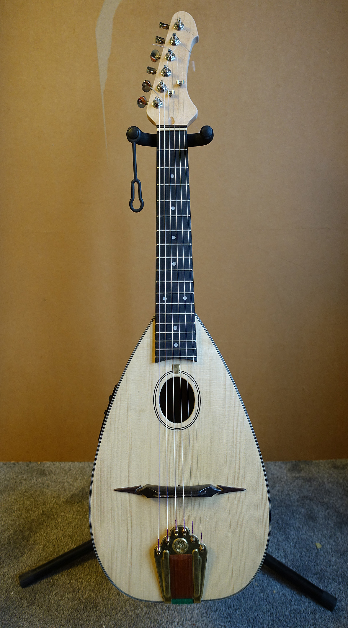 Yes, a hole in the middle of the tuners. Ooops, I didn't know you poke the string in there and get winding! The prob was more to do with the lack of any angle of the headstock, so the low E was barely resting on the nut. Solved by drilling a hole through the post and re-routing the string. These photos were before I did a couple of mods - took some height off the frets and gave a nice polish. I've tuned it up 3 tones now and it's a lot easier to get it sounding in tune across the whole range. It will probably go to 4 up but I'm just letting everything settle down. I'll then lower the action a little (I've made an ebony bridge insert which sits on top of the Bigtone in a slot in the bridge. Tone is quite pleasing - like a soft banjo. The recording is the Saz for the chords and meIody. I present my.. Sazz Manouche: