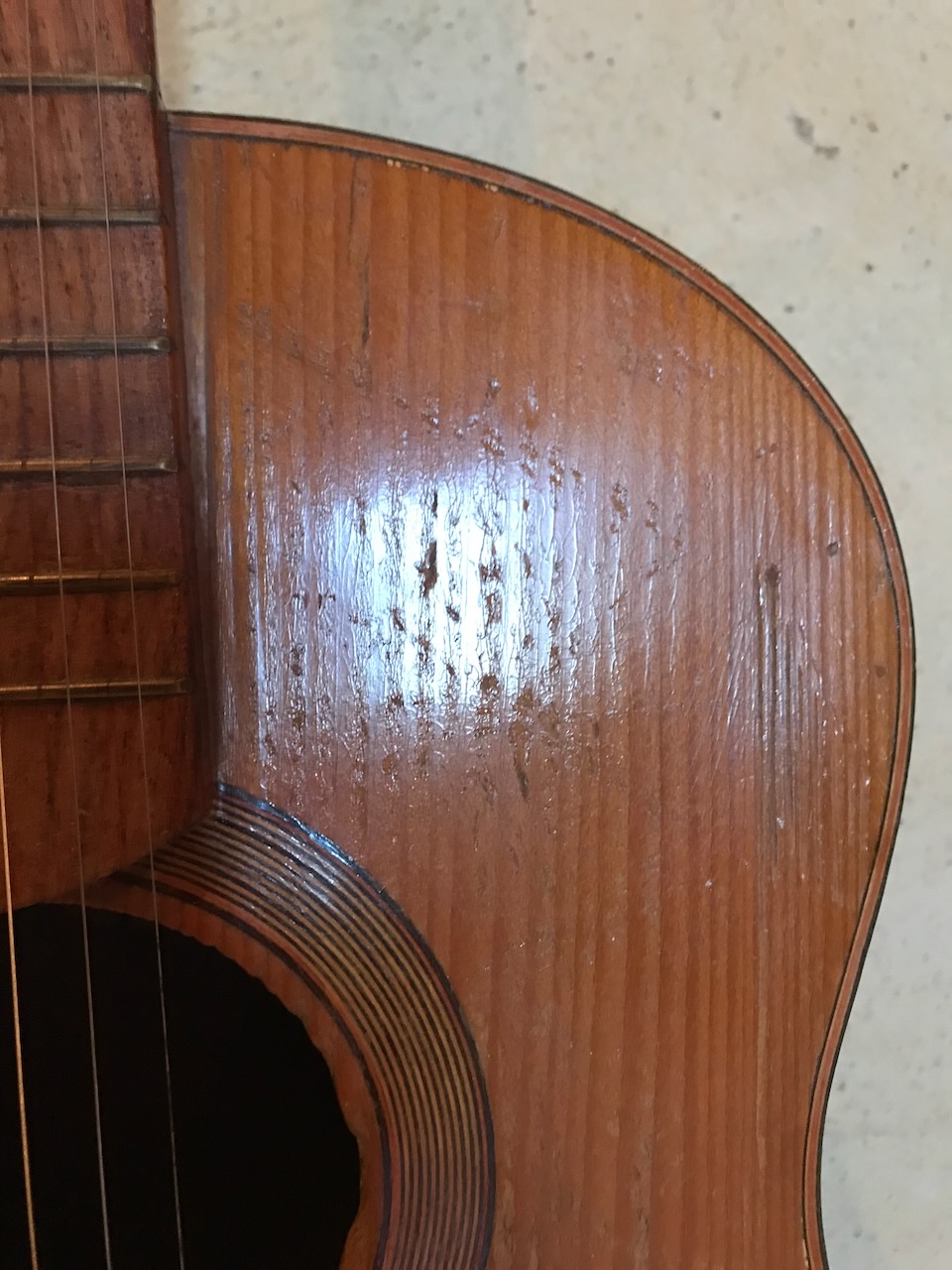 Hi Elienu, I have seen that guitar as well, I have no idea... . Difficult to tell who made this guitar.. . But I have a non-cutaway gypsy guitar with exactly the same bindings that also has a similar three piece neck. There is a Symphonia label in mine, but Symphonia was only a reseller. The top is quite "bombé". It still needs to be restored.