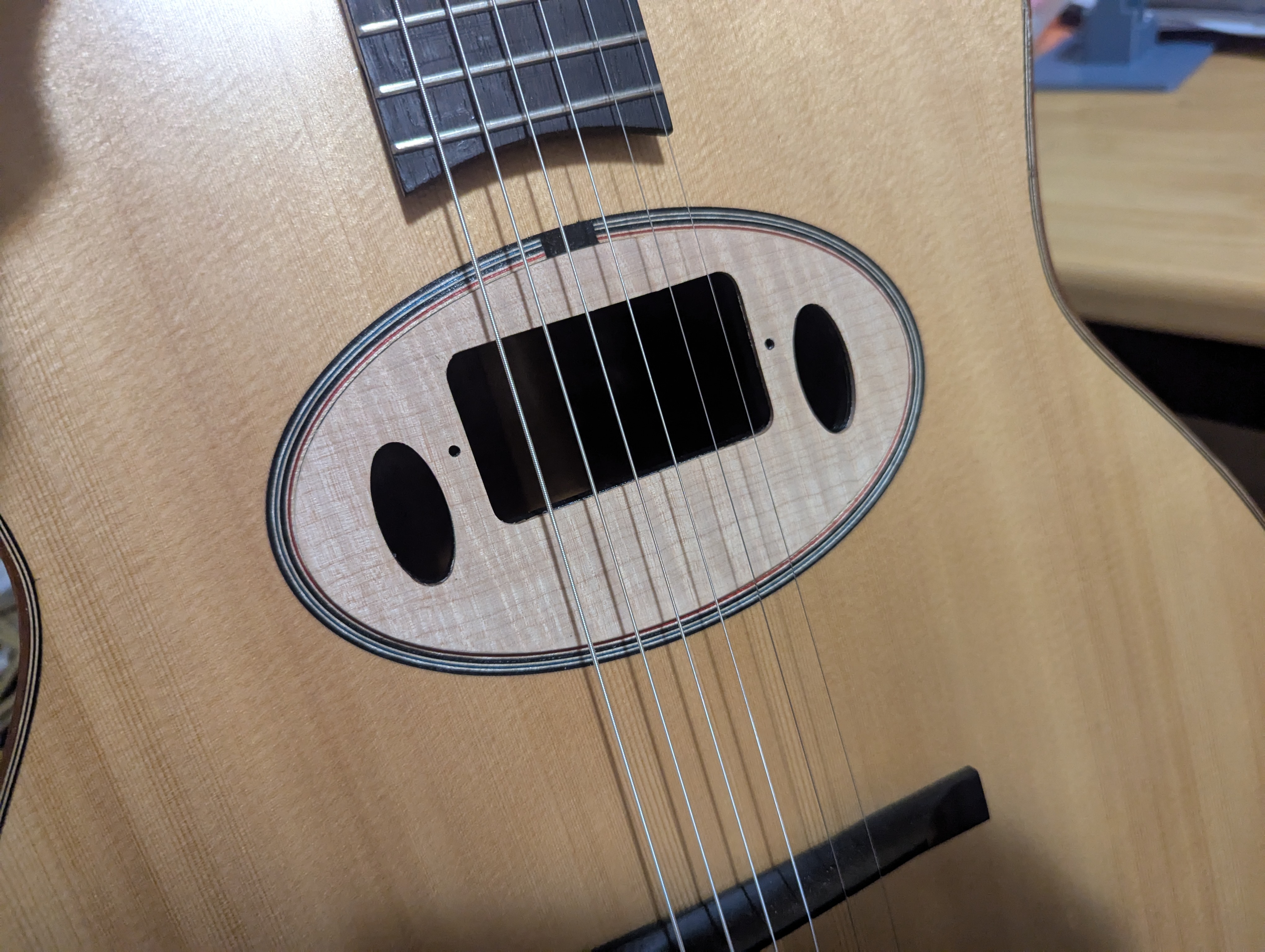 Here's something else I'm working on. I don't really like the looks of wires coming off the top of guitars. So I have planning this for a while. Additionally the goal is to help tame the sound of these guitars to make them easier to amplify and mic for live settings. So this is a humbucker mount with some small sound holes to tame but not eliminate the acoustic sound.