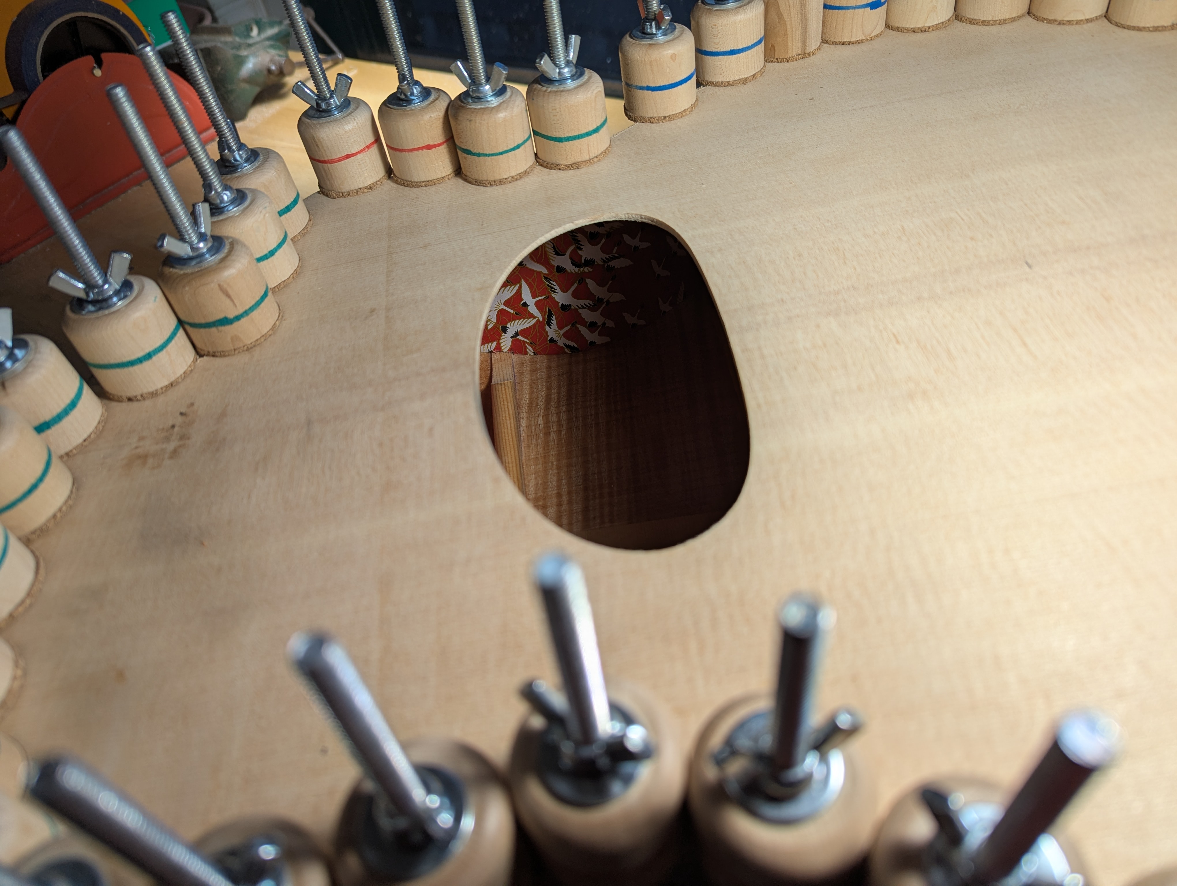 Are you making a rosette? Looking great!!! Can't wait to hear it being played!!!! I'm going to Django in the Bay next weekend, and am excited to meet some well known luthiers and hopefully have a strum of their creations. I've got total admiration for you and anyone else that makes their own gypsy guitars. Skills!!!!!