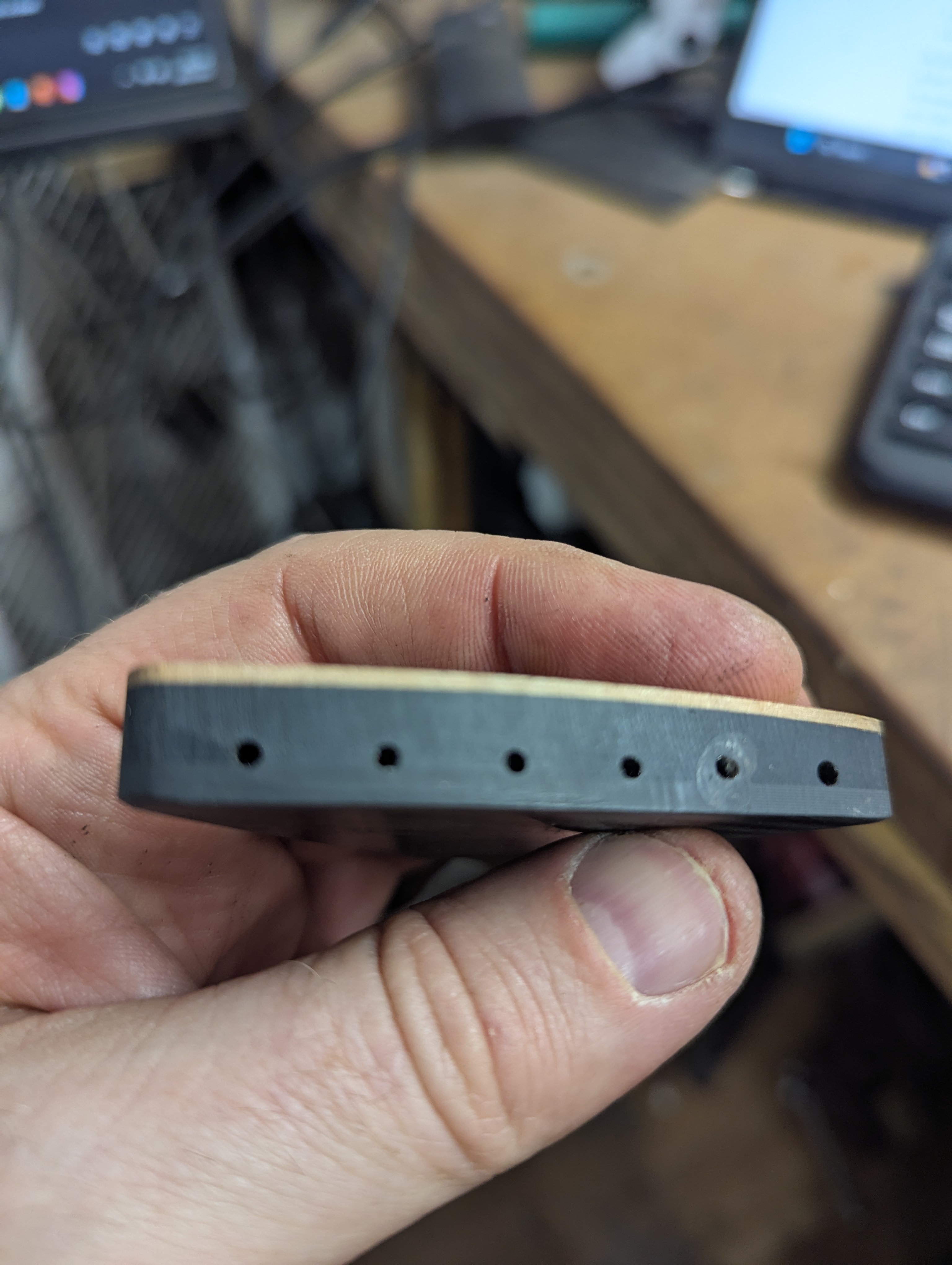 Just spent 5 more days working on tailpieces. I think this is it but designing a tailpiece I like that doesn't explode has been a process. This one is actually not very hard to manufacturer and I think is going to work well. This one is ebony laminated to carbon fiber plate. I have some maple ones I made too. I think because the CF is doing the heavy lifting I can kinda use a lot of different woods.