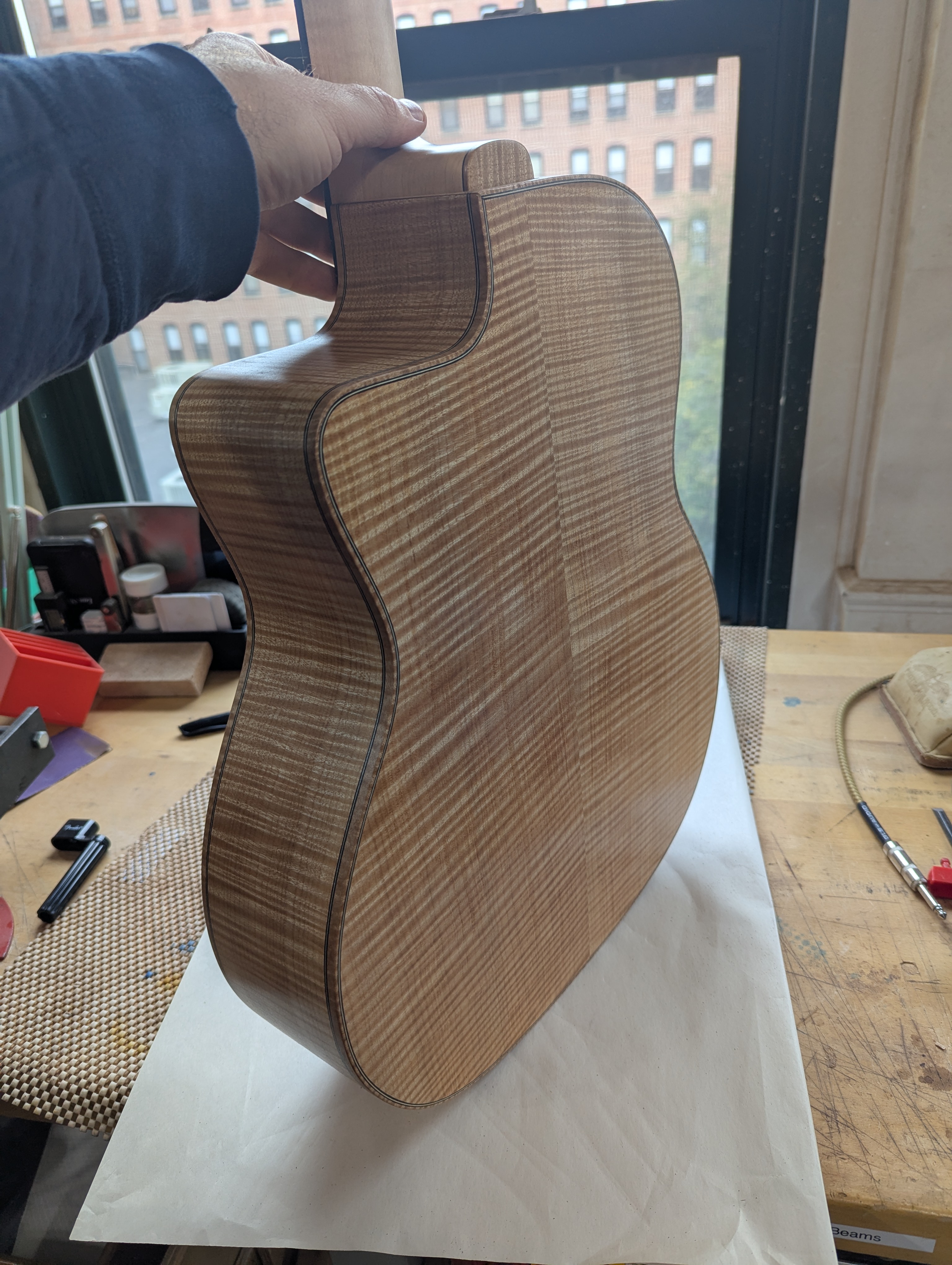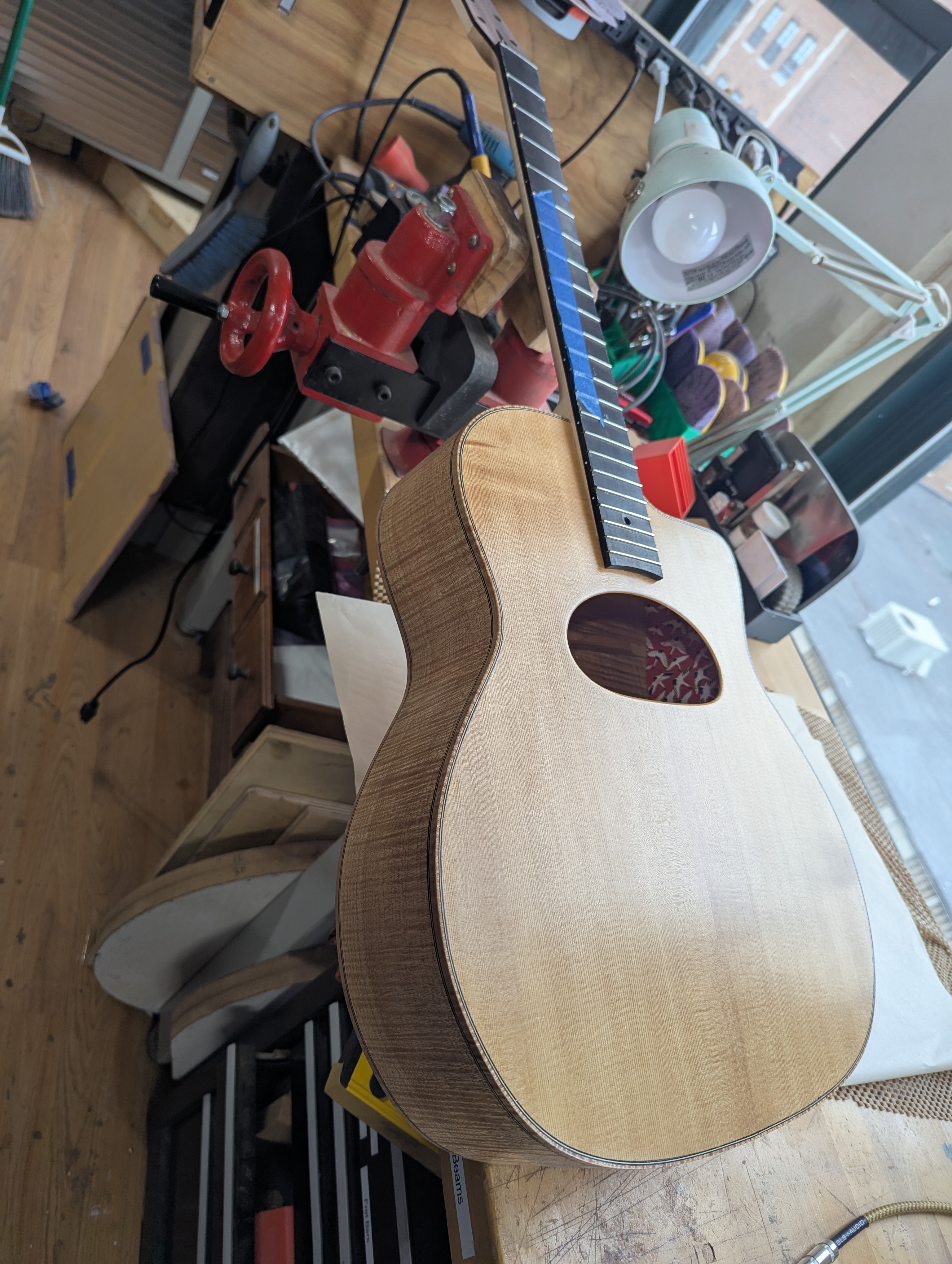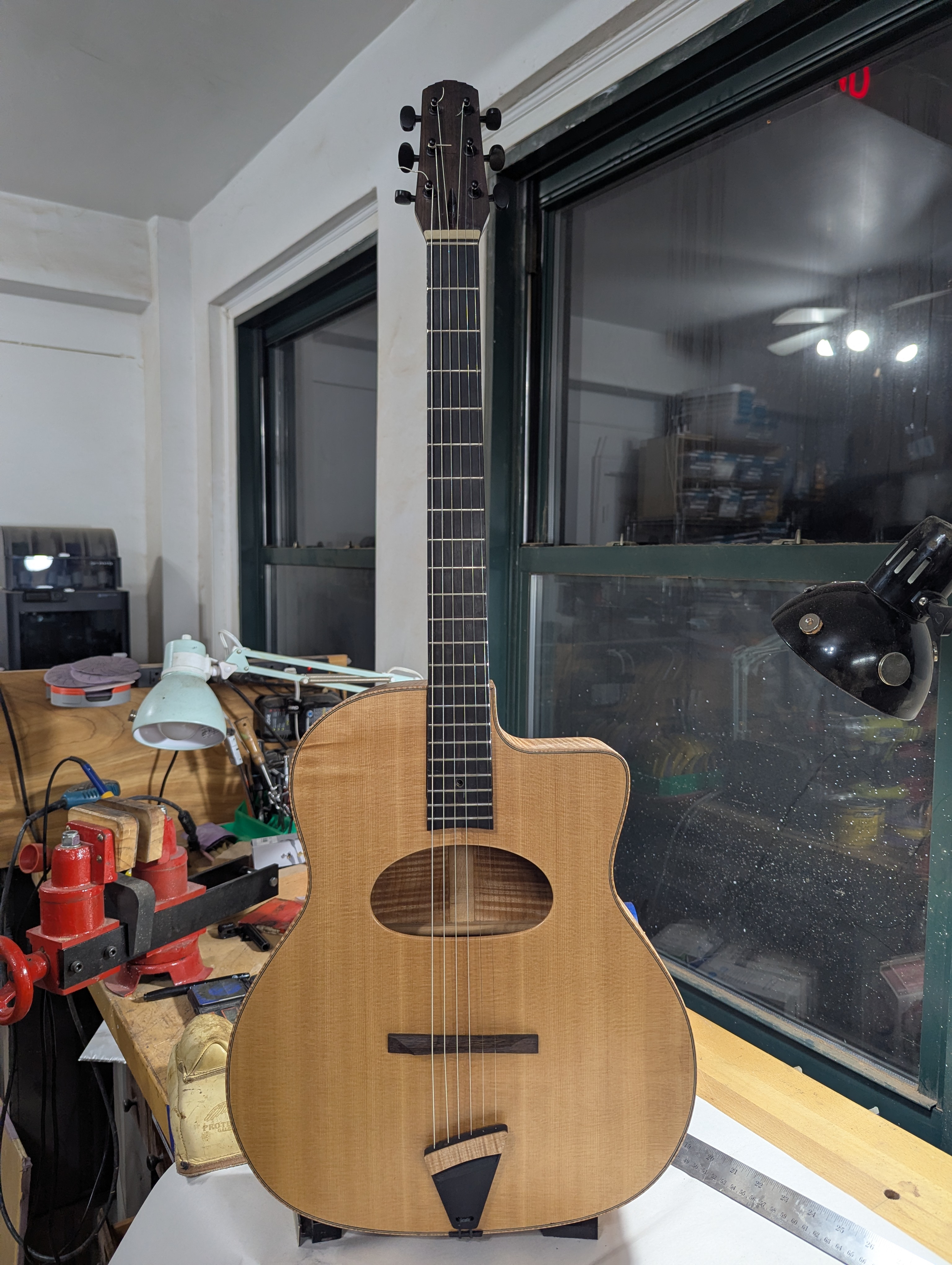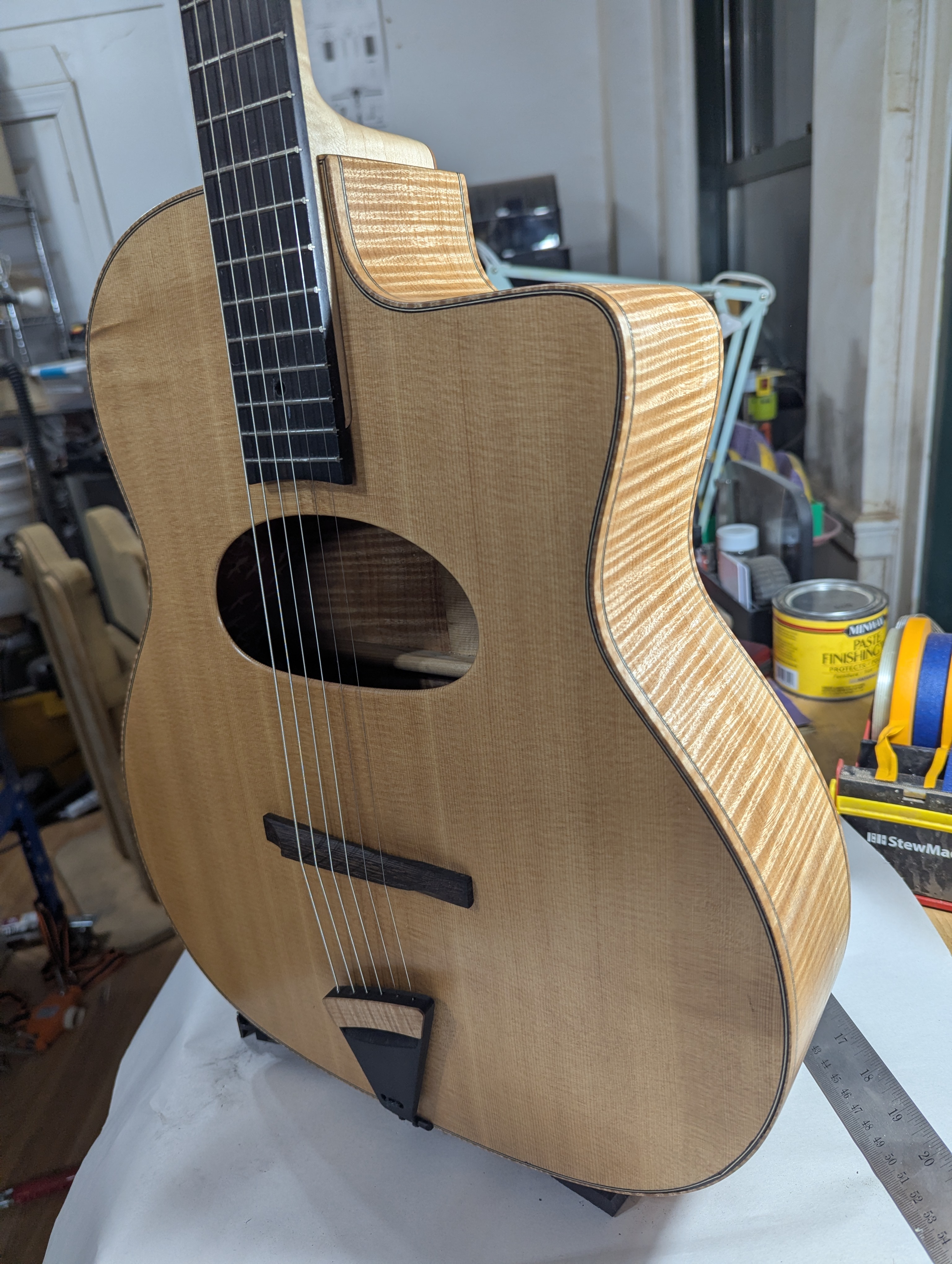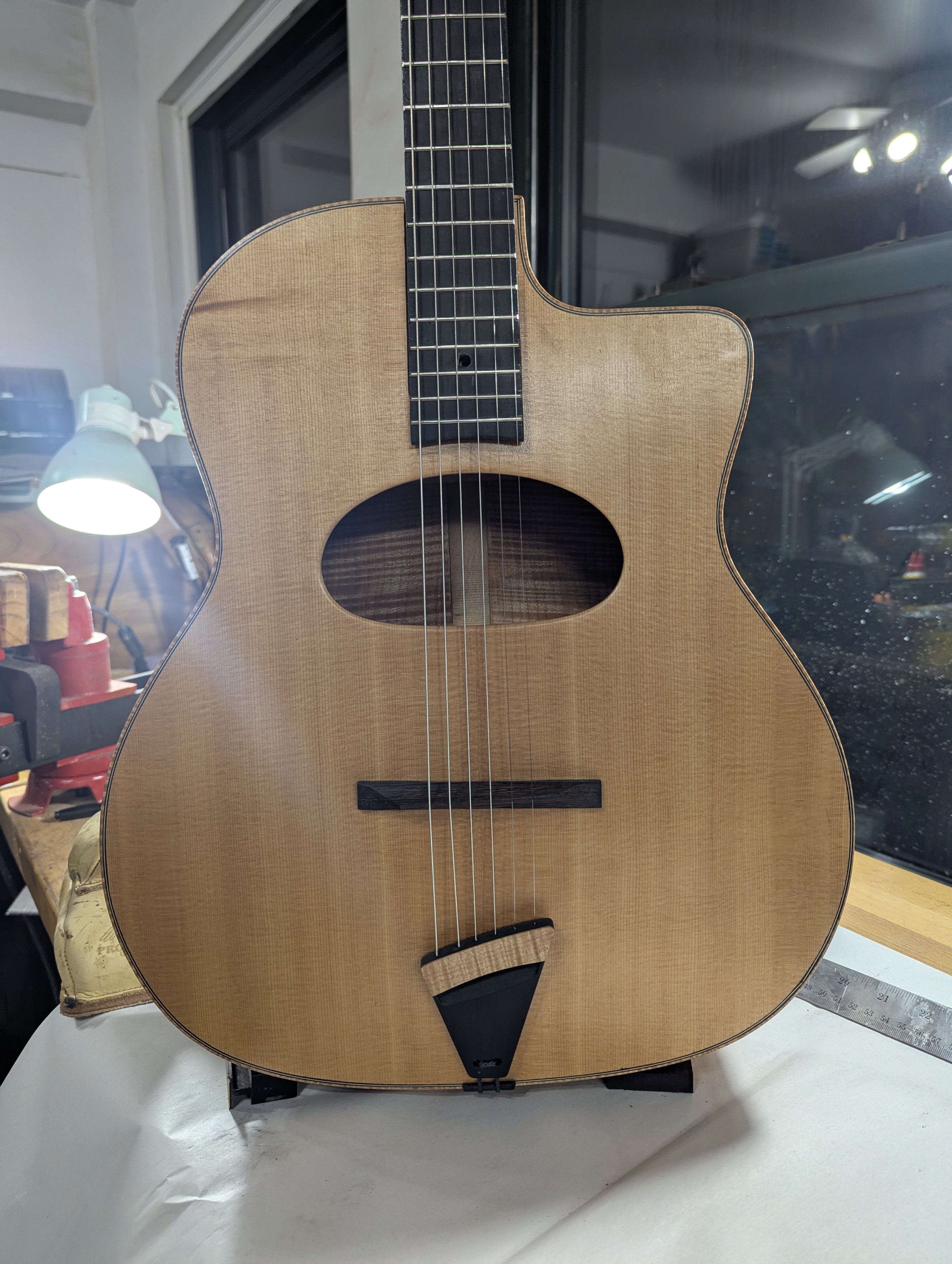 This one is almost done...needs final finishing. And I will make a pickup insert for it. This is a version of a guitar I wanted to make even before I started making guitars. Like 2019. I've had to change some things that I wanted (initially I wanted modern archtop soundholes and a built in pickup) but style wise this is pretty much it.