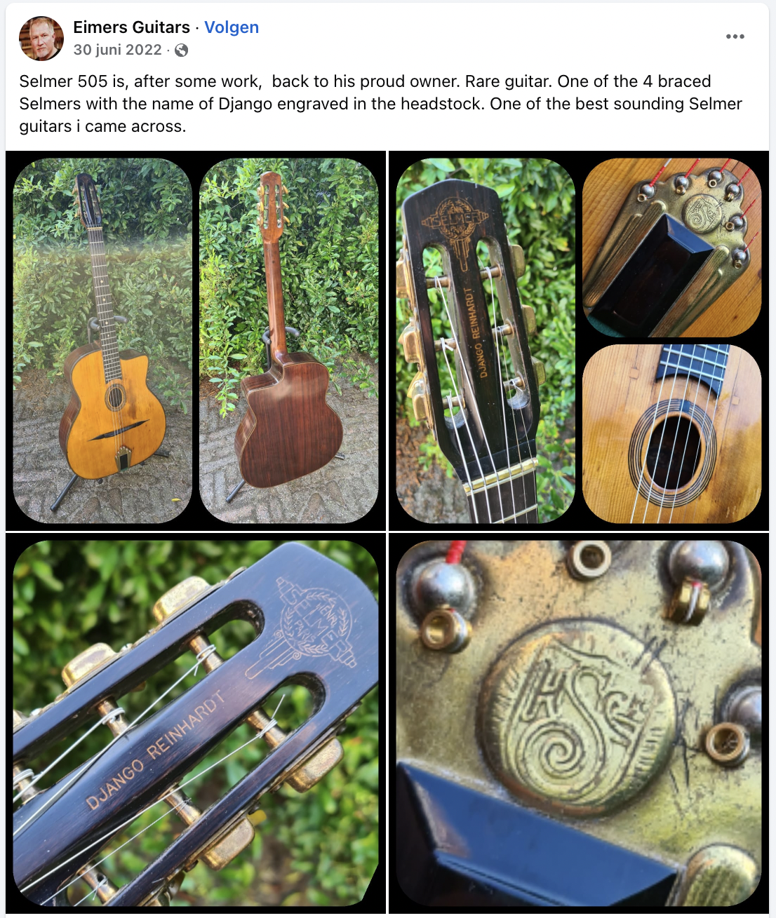 Note: this limited endorsement trio built by Selmer is unrelated to their commercial D. Reinhardt model, which featured “Mod. Django Reinhardt” in italic script on the headstock, of which an estimate of 40 Selmers were produced, according to F. Charle's book (although as a collector I think this may have been an overestimation).
