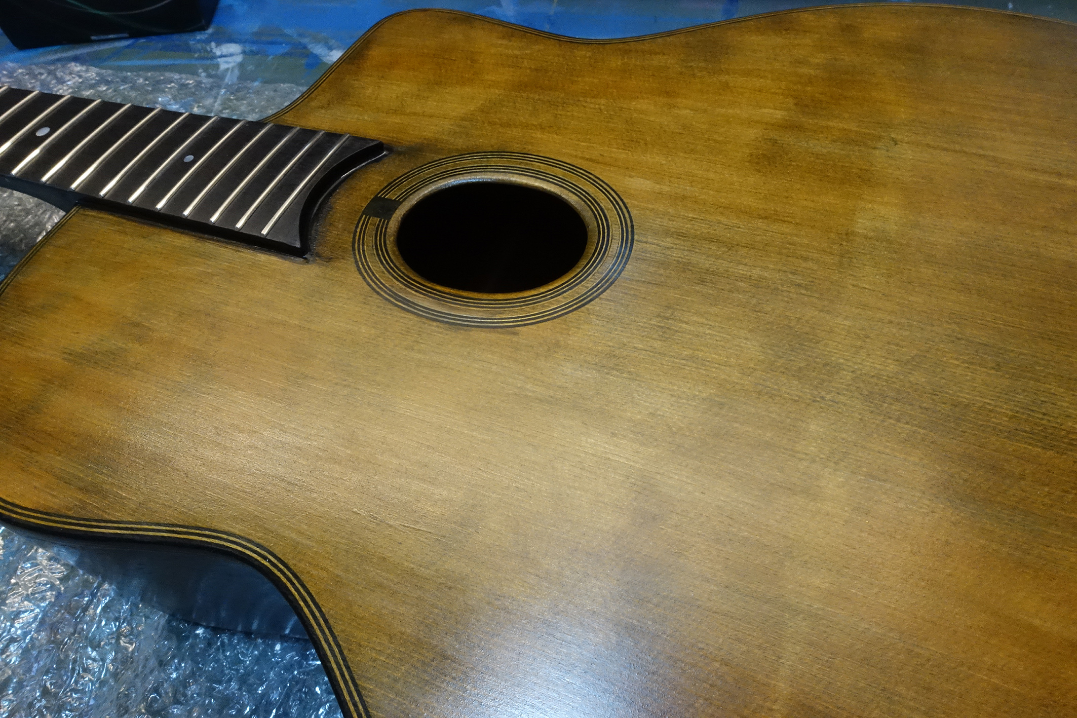 Back and sides are laminated rosewood - must be careful not to go through the rosewood!!!