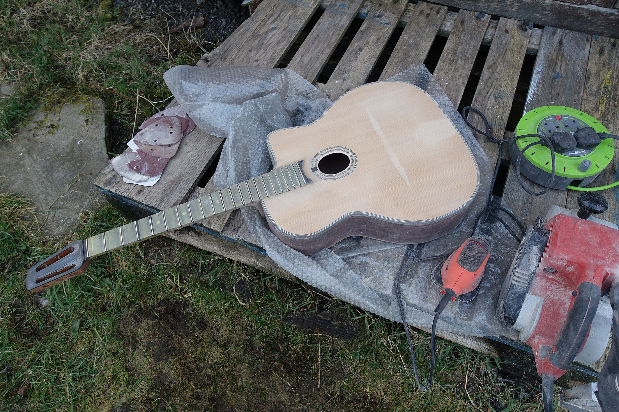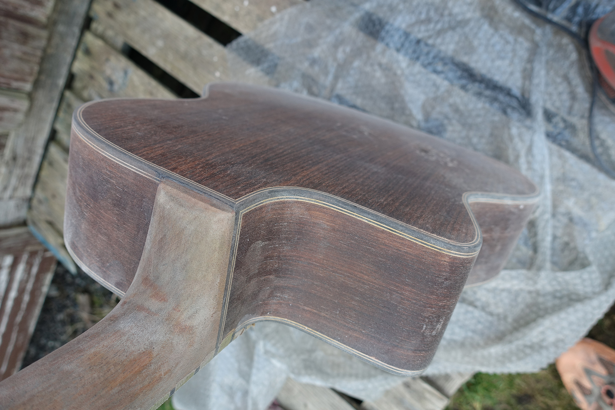 Ok, managed to get the whole thing back to bare wood. Wow, what a ludicrous amount of lacquer!!! Much more than both Gitane 255s which I have worked on previously. I now have to decide whether to 'distress' the guitar, or something else. I'm tempted with the aged vintage look. Killy Nonis is making me a Selmer tailpiece which I can age with cold patination fluid. The original JWC tuners already look a bit old, but I could age them as well.