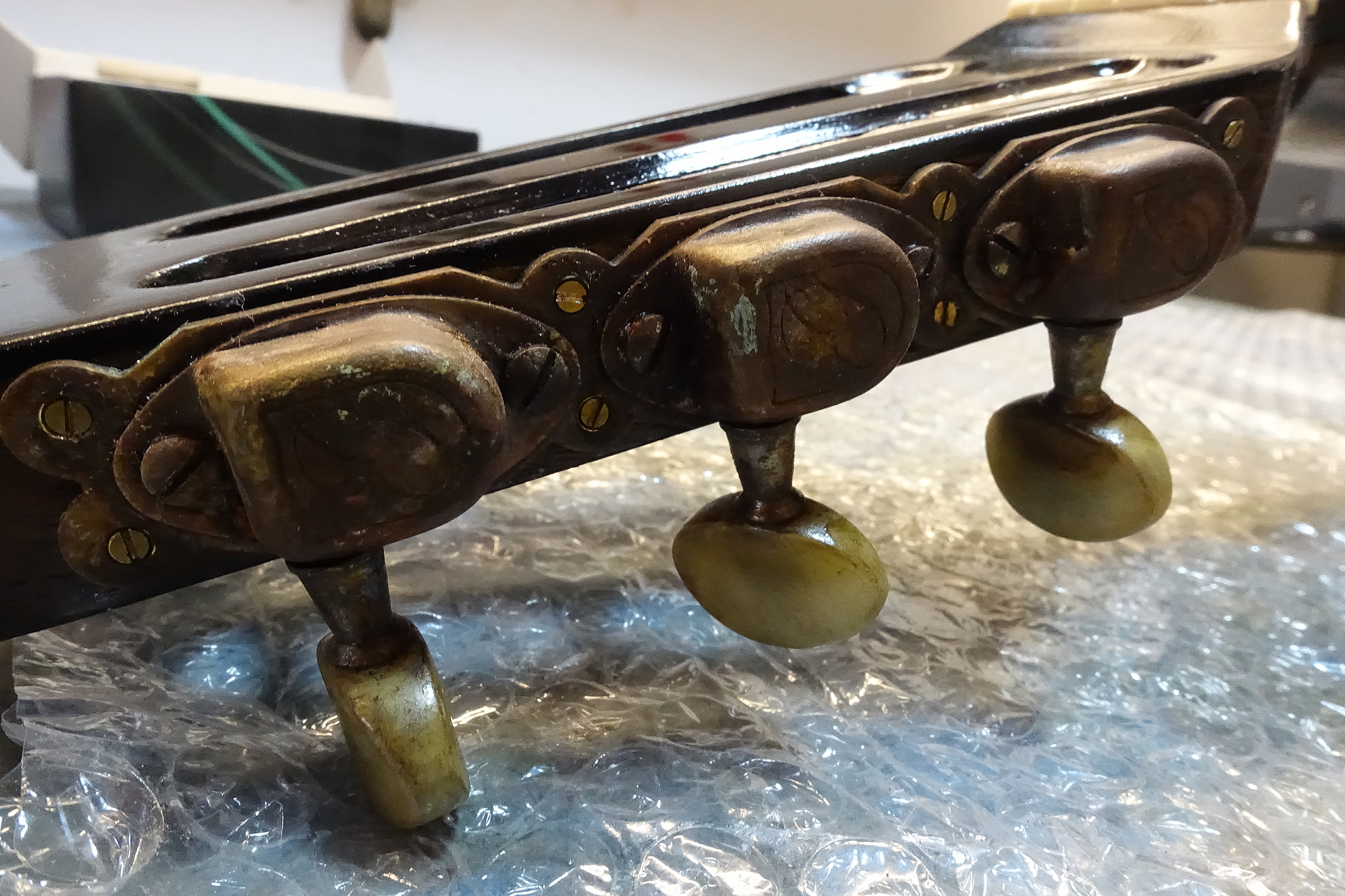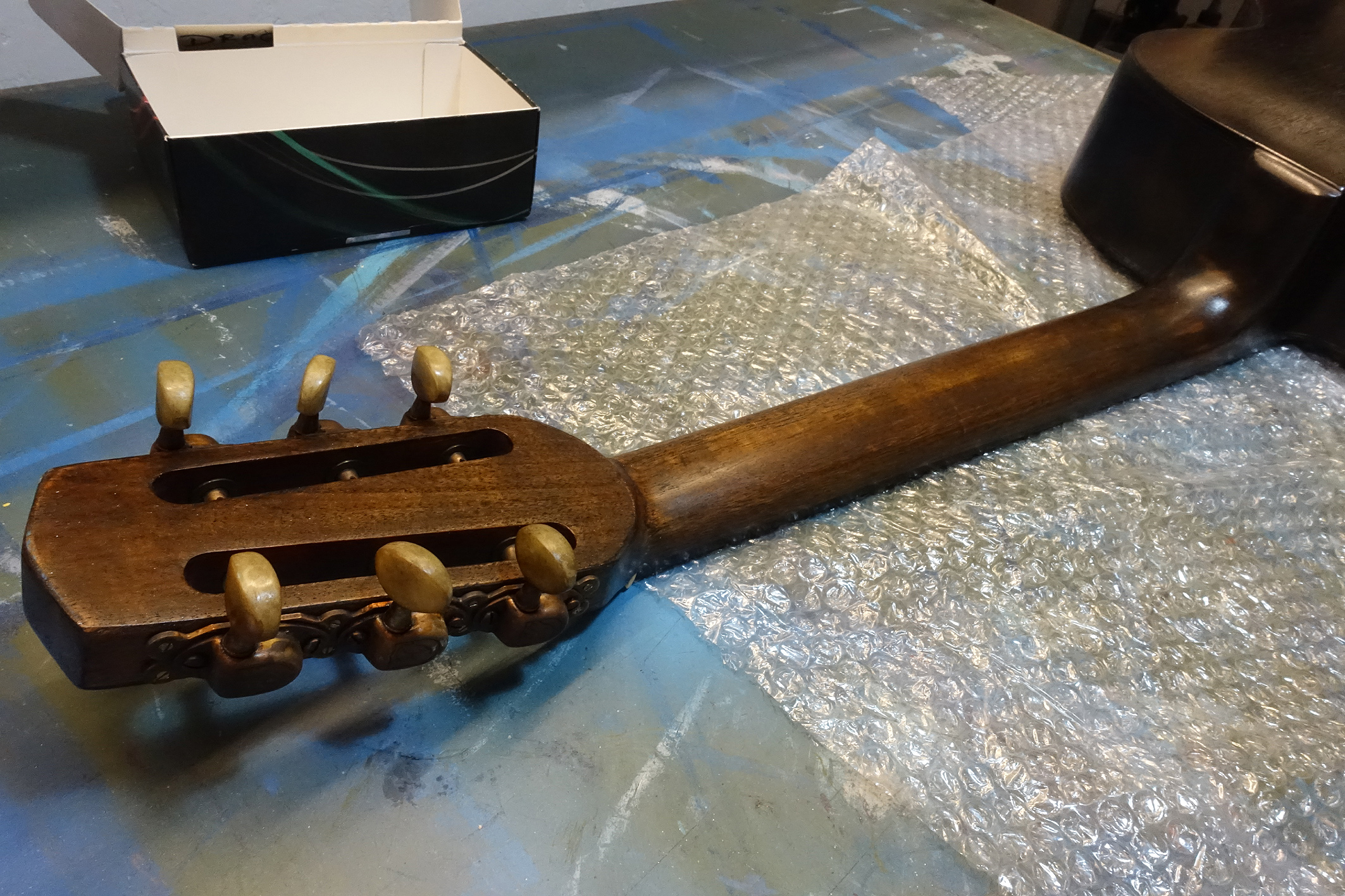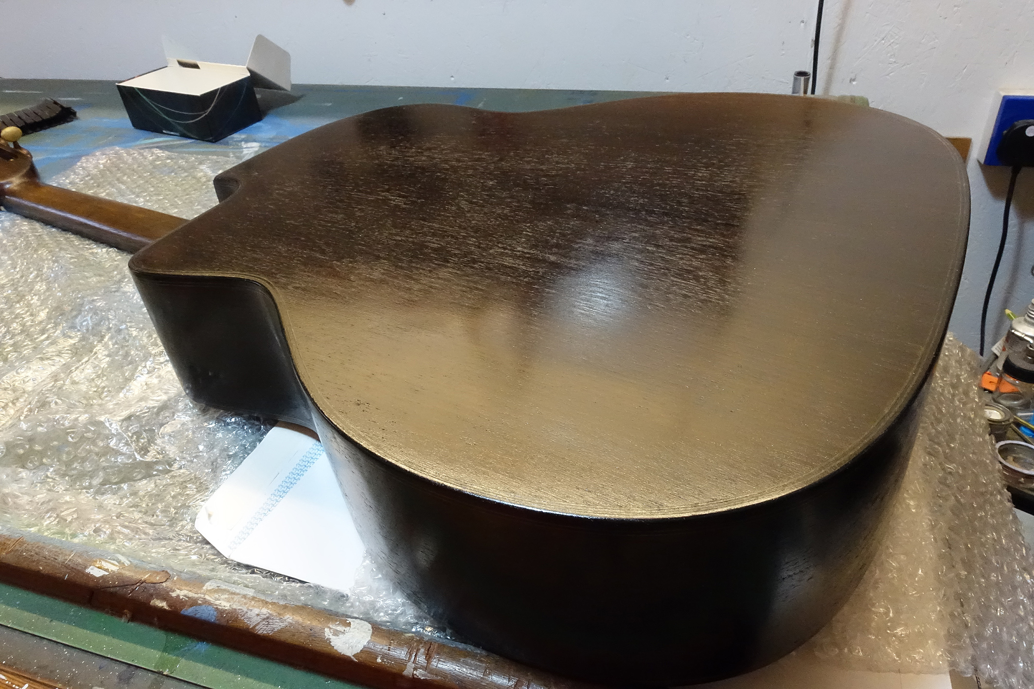 A bit more tinkering. I decided to play it safe (perhaps boring!) and give the whole guitar an aged look. Back and sides dark stained, neck buttered (thanks Paul, nice stuff and feels slinky), top lightly stained to give an aged, patchy appearance. I'm not sure if that 'open pore' look on the back and sides is exactly what I was after. Should I have used something to fill the grain beforehand? It hasn't bothered me on previous guitars I've refinished, but perhaps because of the almost black finish, it's showing up a bit more than expected. My friend's Polak/ERG has a similar finish. It at least shows it's not covered in a kilo of lacquer! I also aged the brass machine heads and changed the 9th fret side dot to a 10th. The neck is so nice!! I will go back to my Di Mauro Boogie Woogie and give it the same neck treatment. All I'm waiting for now is a Killy Nonis HSC tailpiece and it'll be exciting to find out what it sounds like now. Frets are level, smooth and highly polished!!!