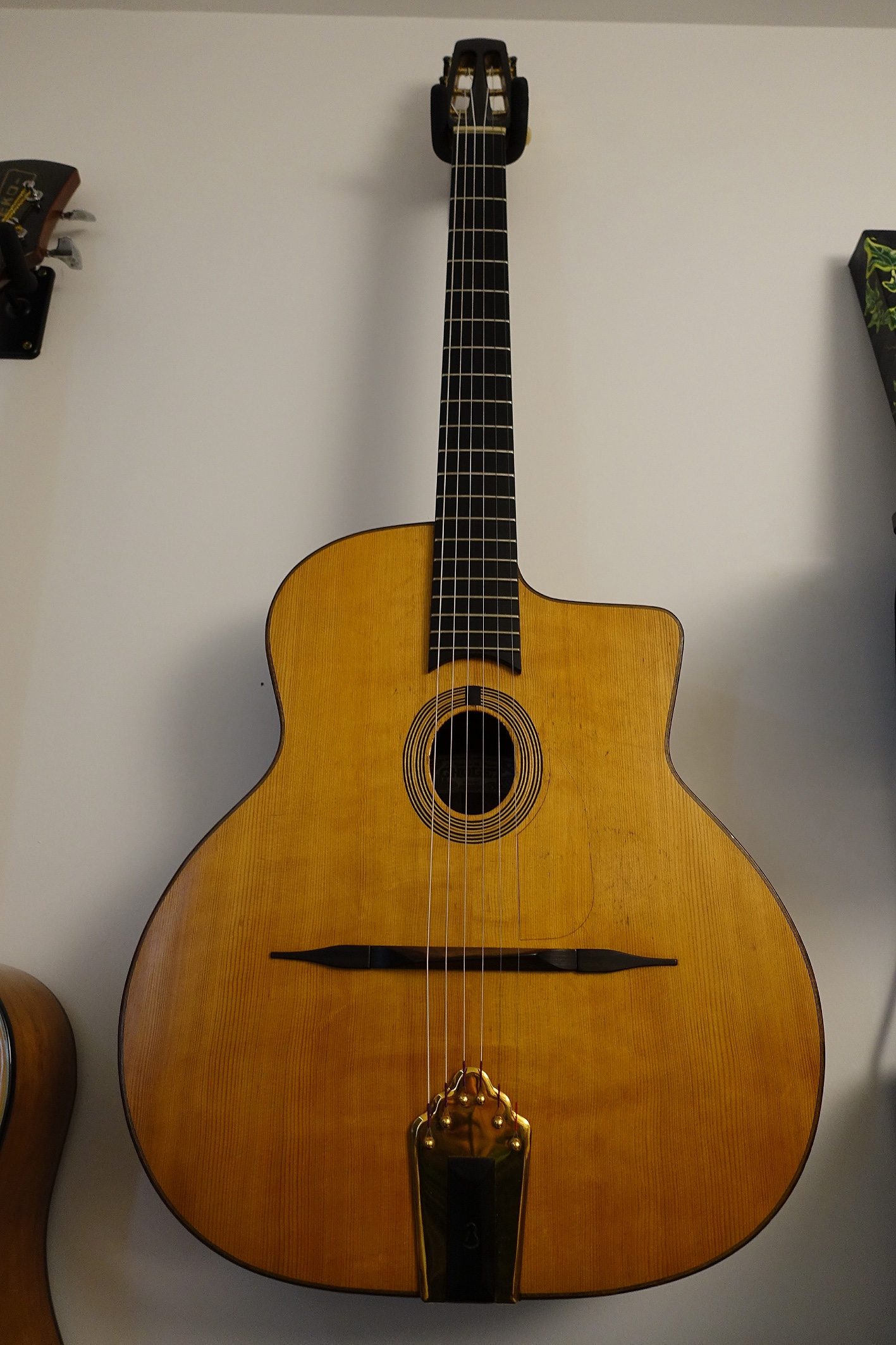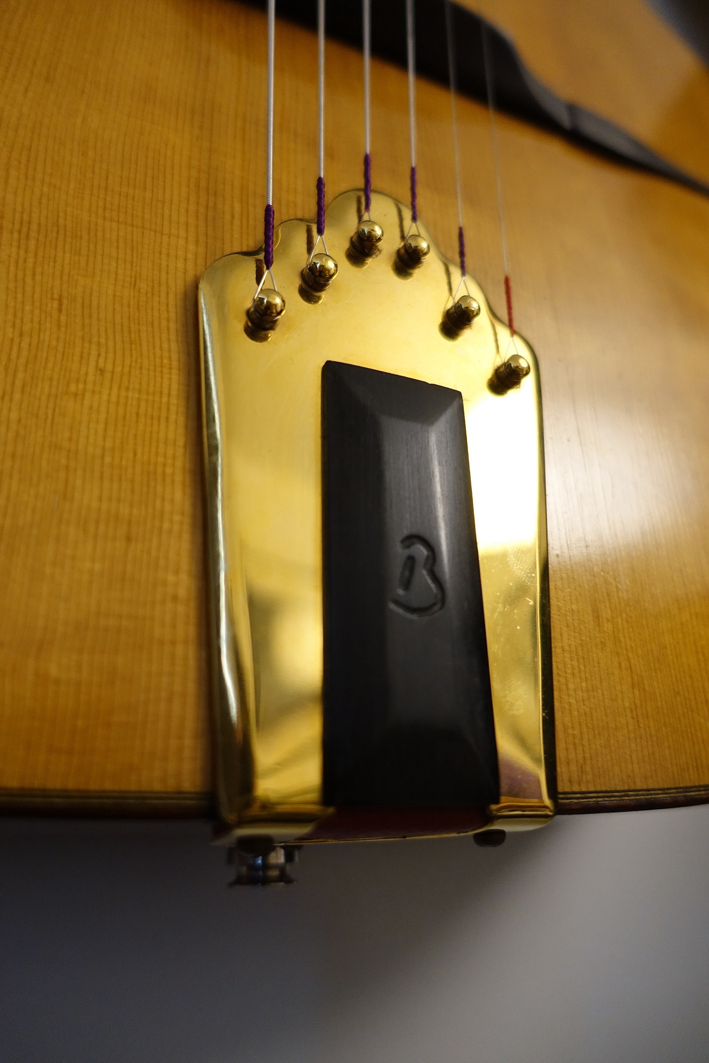 I bought this tailpiece on Ebay a few years ago. I'd been waiting for a suitable guitar to put it on, and it suits my Cholet (bought last year, also on Ebay!) very nicely. It has a longer reach and seems to suit the very large body perfectly. Anyone recognise it? I wonder who made it? I emailed Benedetto, but they're not sure.