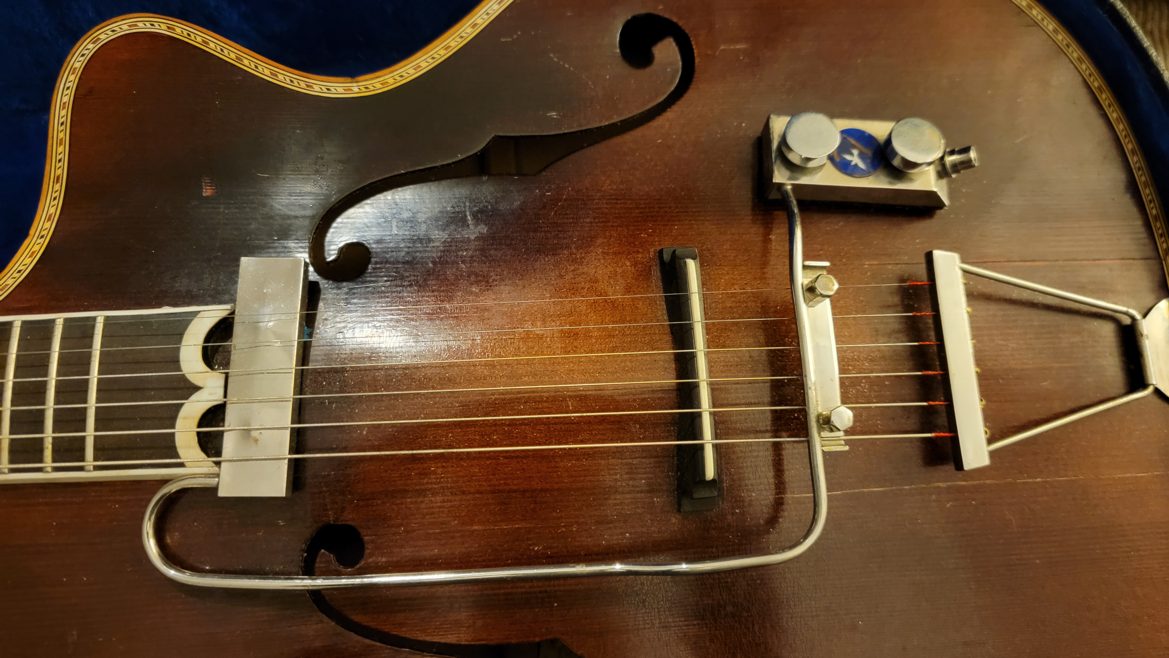 That's a great find. Are you saying the guitar is German from the 30s, or the pickup? I'd use the contact cleaner on the potentiometers before doing anything else.