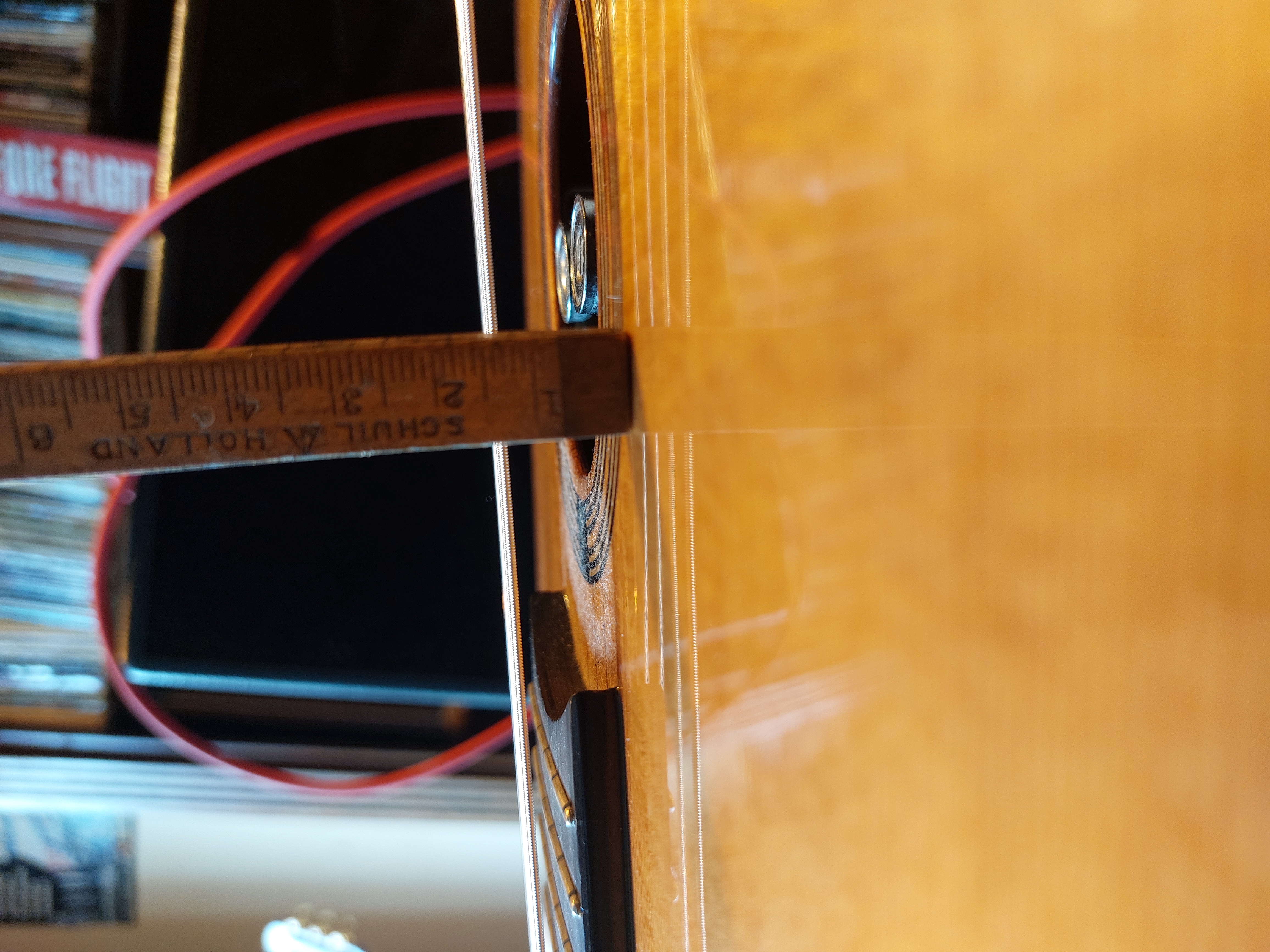 @wim my Yves Guen ST48 is placed in the middle of the sound hole, but you will prefer it as much to the fretboard for more picking space. From the top to strings i measure 14mm, but i placed it a little higher cause it rattles on the top. You can adjust the magnets.