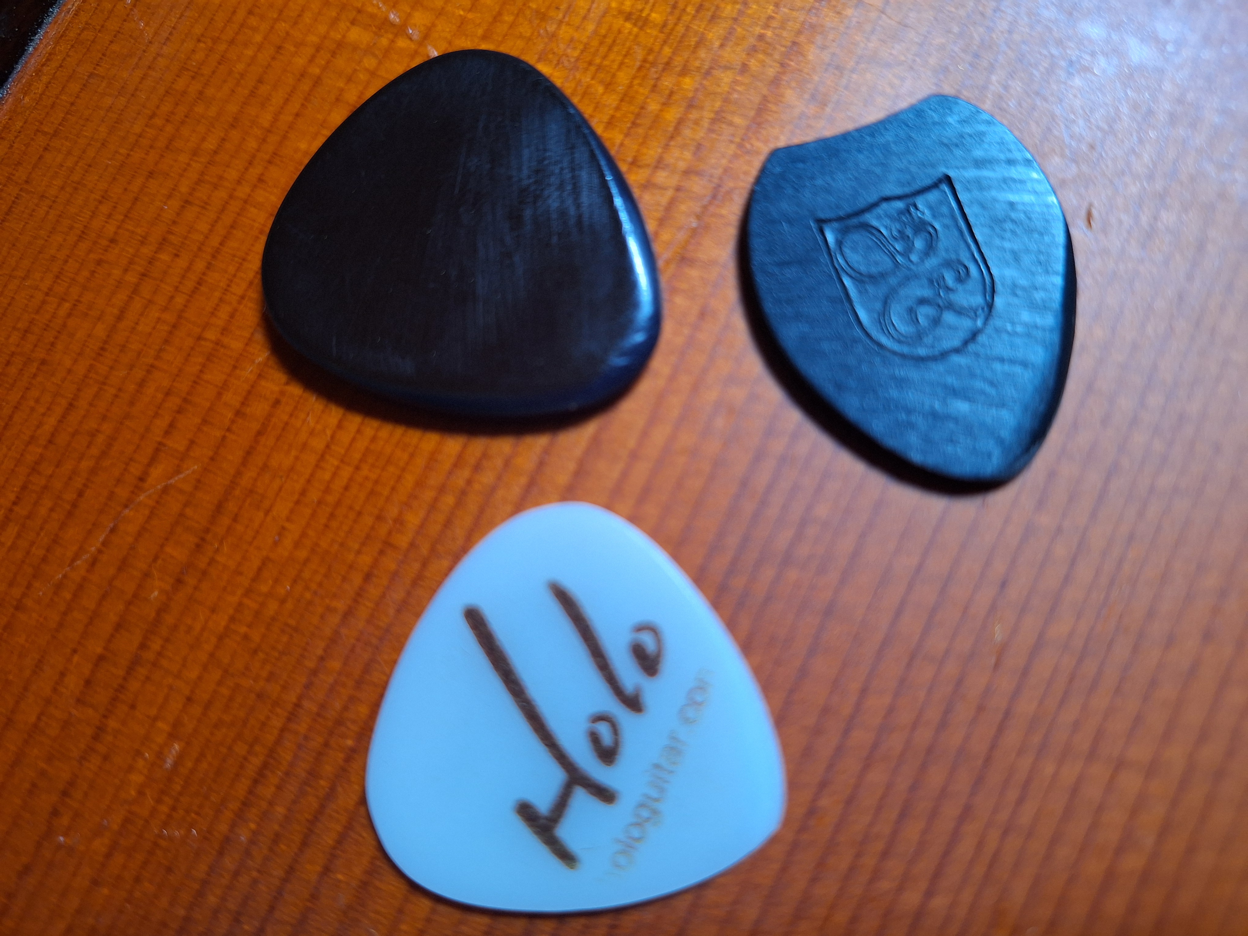 3 classic picks: a Holo(couldn't afford the guitar🙃), a bakelite(a buddy made) and a Stochelo Rosenberg pick Leo Eimers handed out at DFNW.