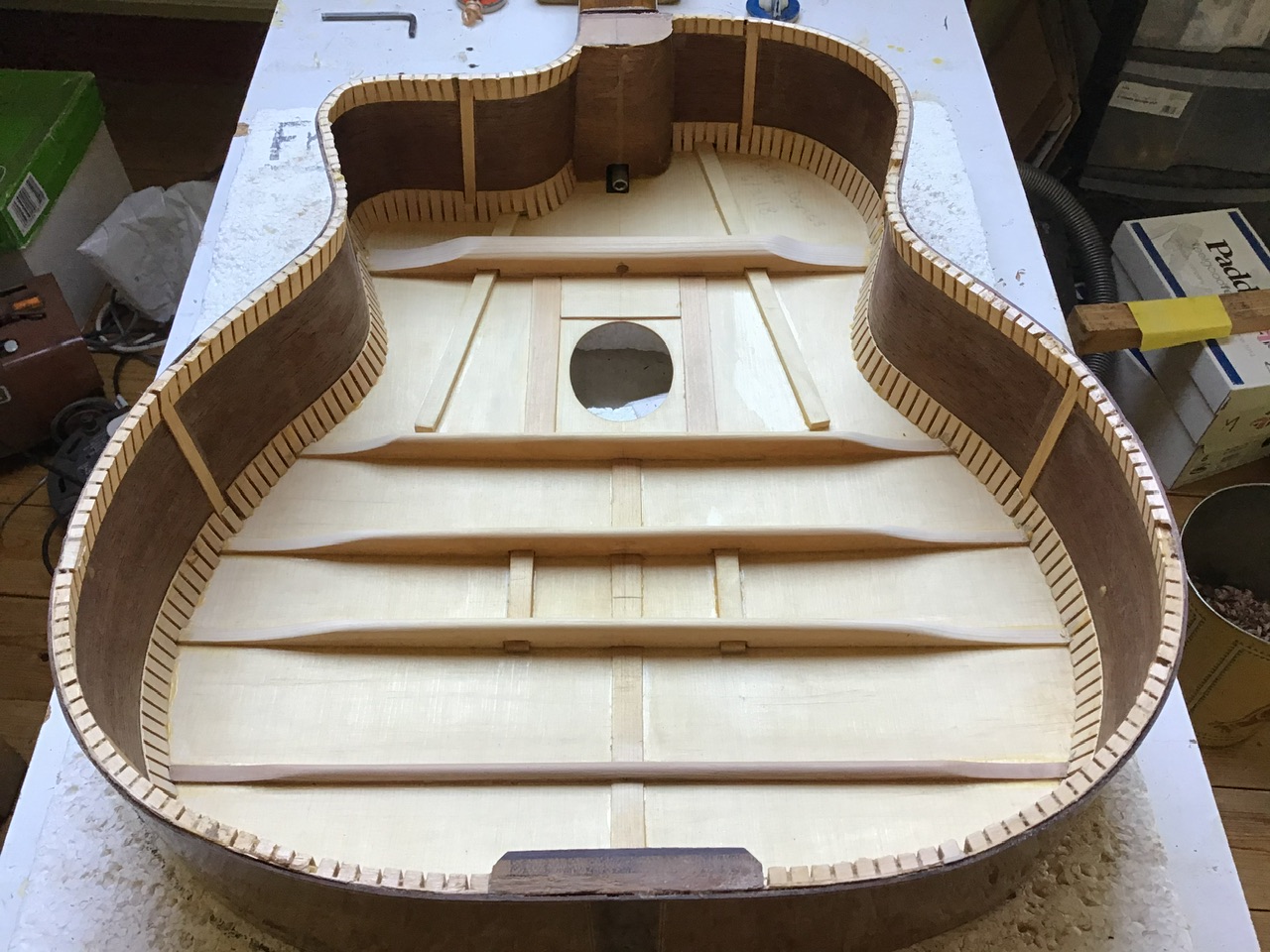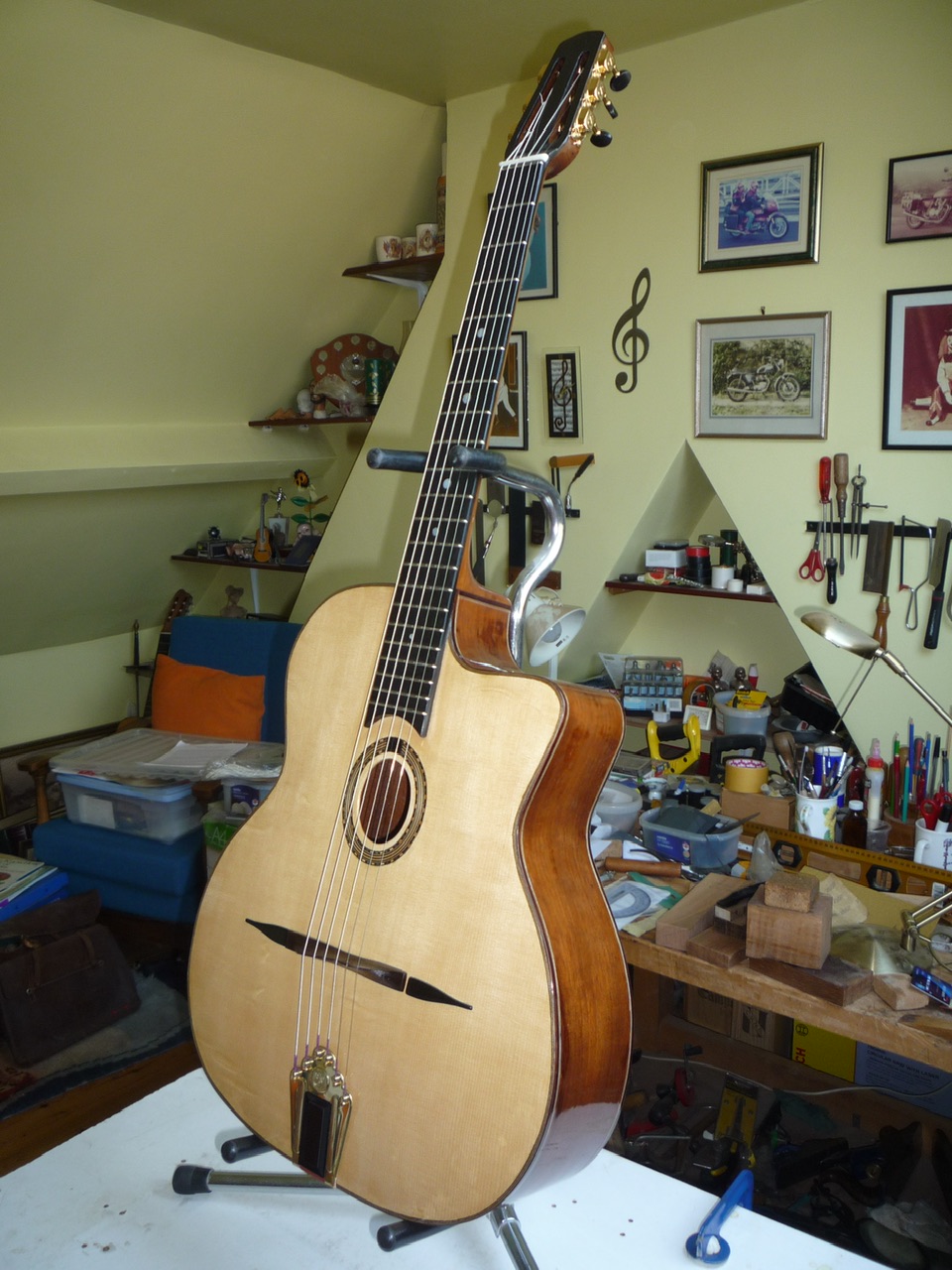 . The soundboards have a heat bent arch (pliage). The finish is French polish. The fifth brace on the oval hole is half the height of the other braces, a compromise with Django’s guitar that doesn’t have one there.