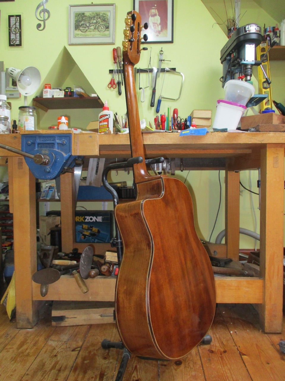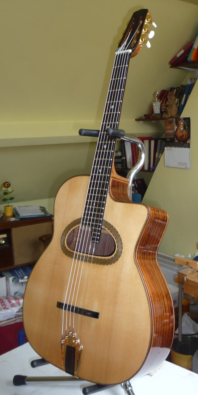 There was recent discussion enquiring about gypsy guitars available in the UK, so I thought I’d post, if allowed, that there are two Selmer Maccaferri type guitars that I built, on sale at Hobgoblin Music, Bristol.. One is an oval hole 14 fret to the body, made of wood recycled from a school science lab desktop. The other is a 12 fret to the body d-hole, with a rosewood body and walnut neck. If anyone is passing by and fancies trying them out, any feedback would be appreciated and useful for future builds. Oval hole - £1950. D-hole - £2599.