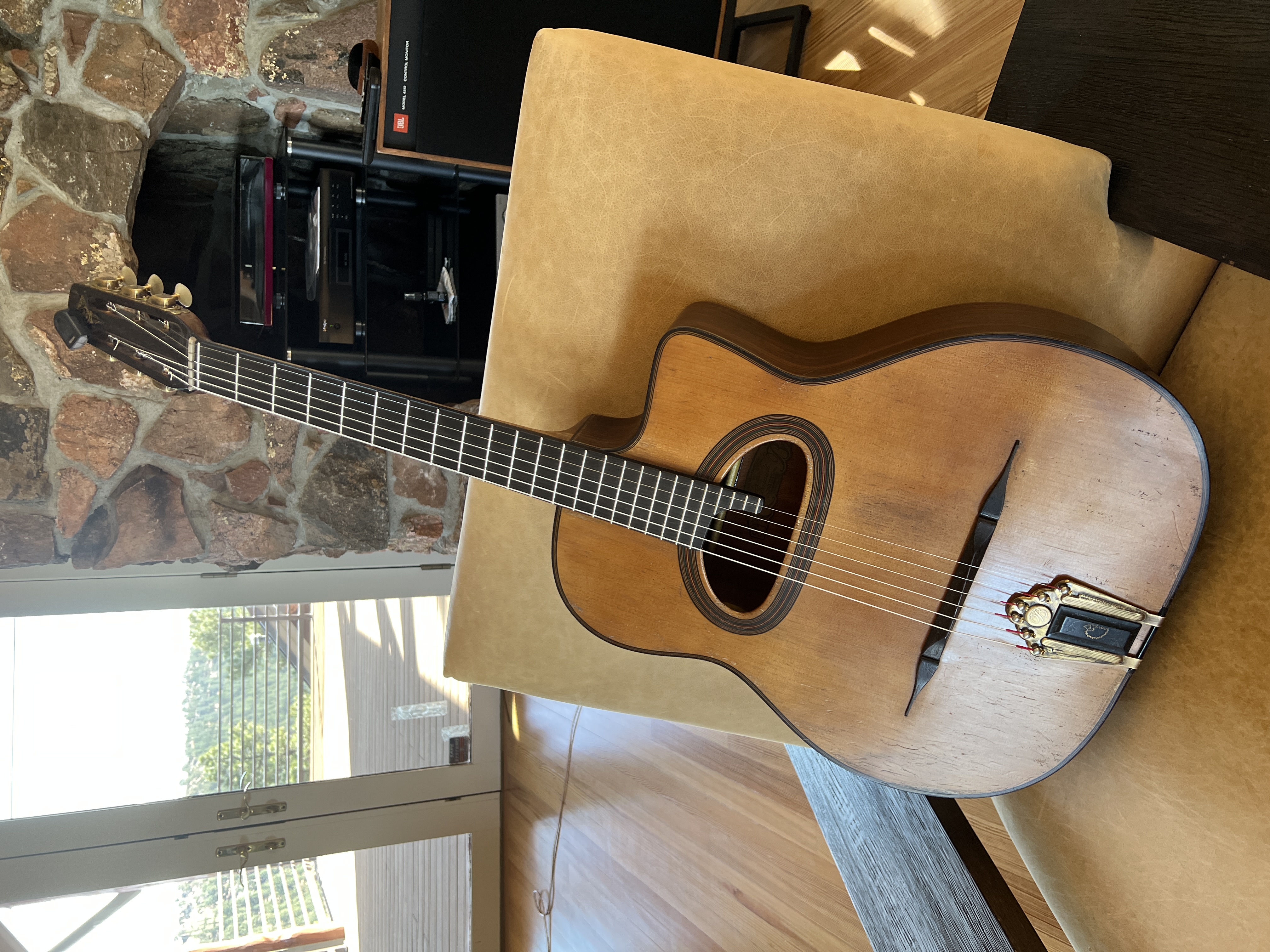 It sounded pretty great from the git-go, but I played it like a fiend yesterday and today, and sicced a Tonerite on it the rest of the time and overnight, and it has just opened up into this huge sounding music machine. I love the feel of the 12-fret neck, and compact size. It doesn't sound like an original, but it's close enough, and I already love it for its unique tonal character, and the OG look. Dealing with Jean from Colorado had its challenges, but between our respective attempts at writing in the other's language, we got it done. The truly miraculous part was UPS getting it from Grasse to Boulder, including customs, duties, etc. in (drum roll...) two days!🤣