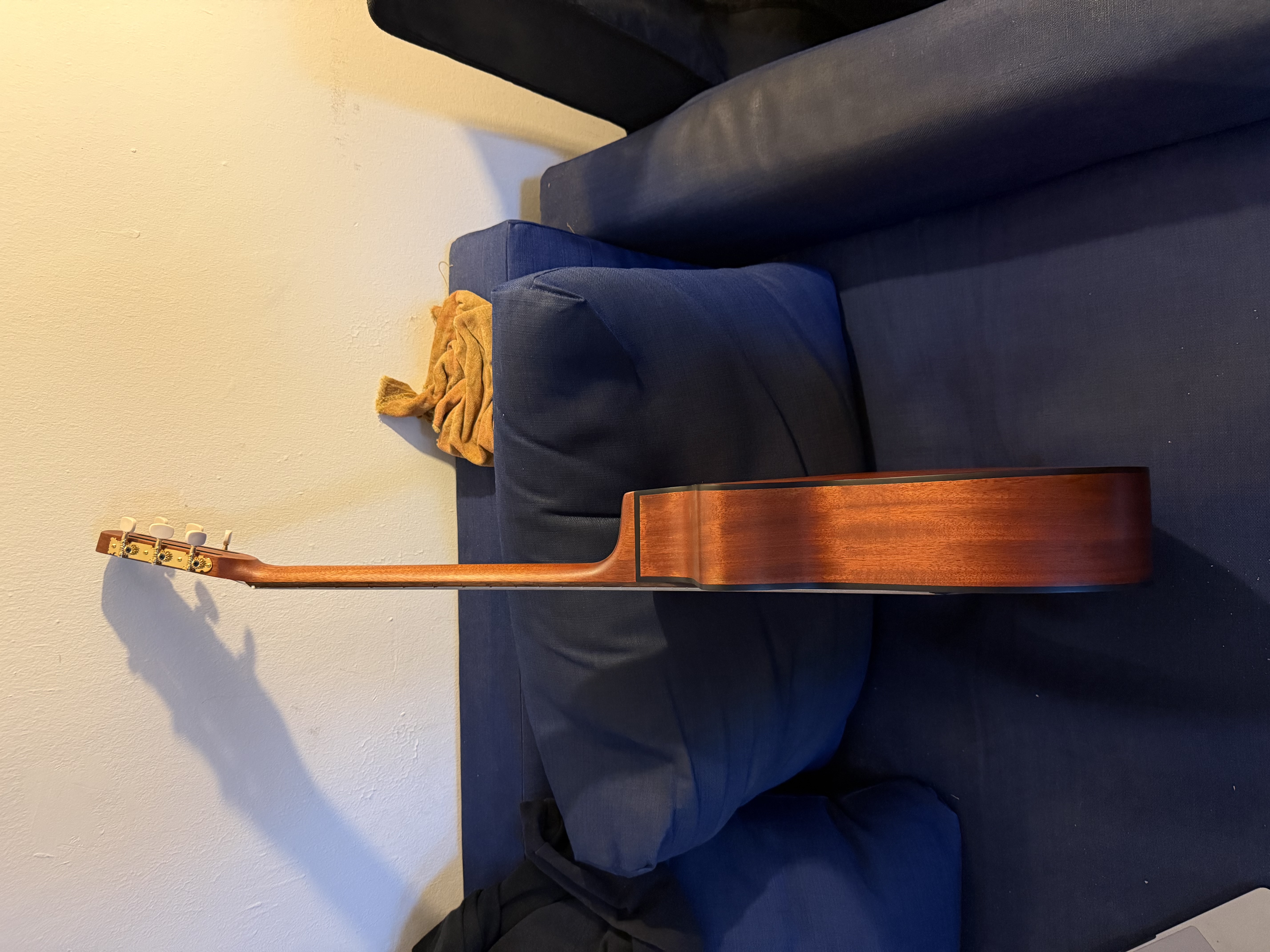 And the sound! Glorious. Dry but not at all harsh. This is a far more versatile design than stereotyping has it. The volume is absolutely stunning, approaching that of my banjos. In fact, the instrument is an amalgamation of plectrum banjo, flamenco guitar, and archtop guitar.