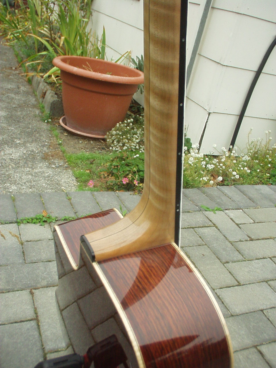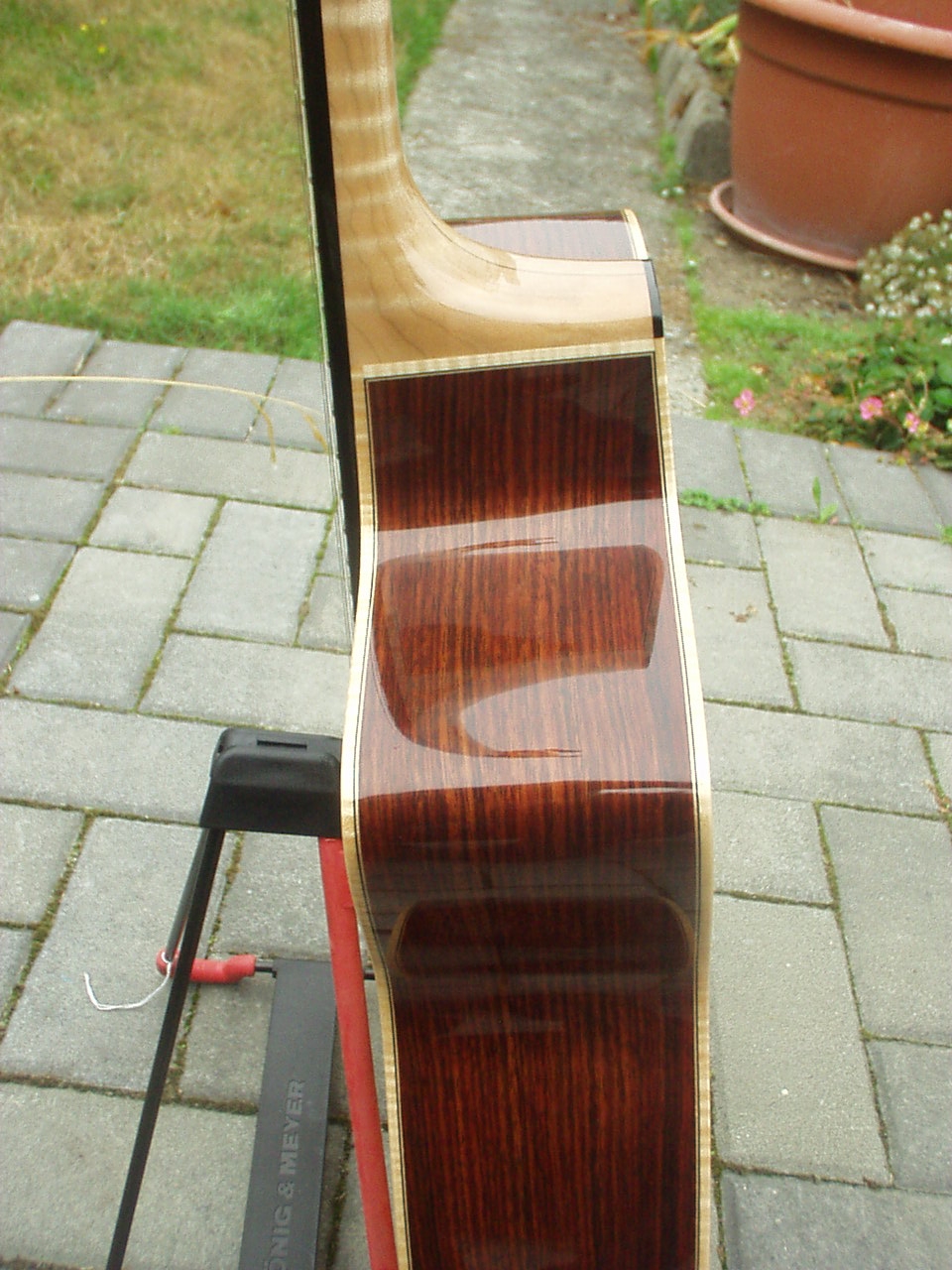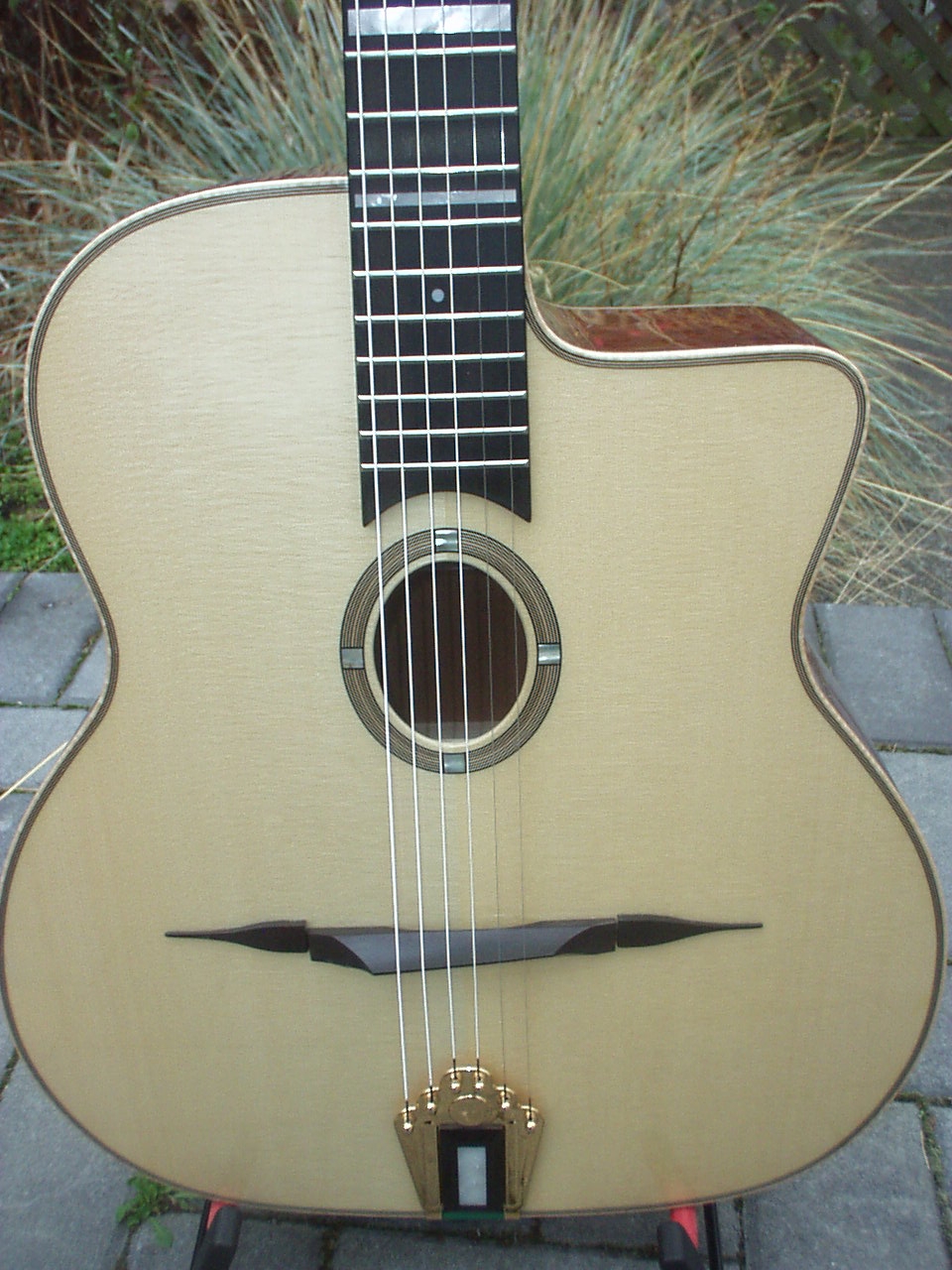 If this is the one that was hanging on the lower left peg of Alain's leftmost guitar rack at Djangofest - it's a nice sounding guitar. Too bad the decoration pumped up the price so much - a guitar with that voice deserves to be in the hands of a working musician.