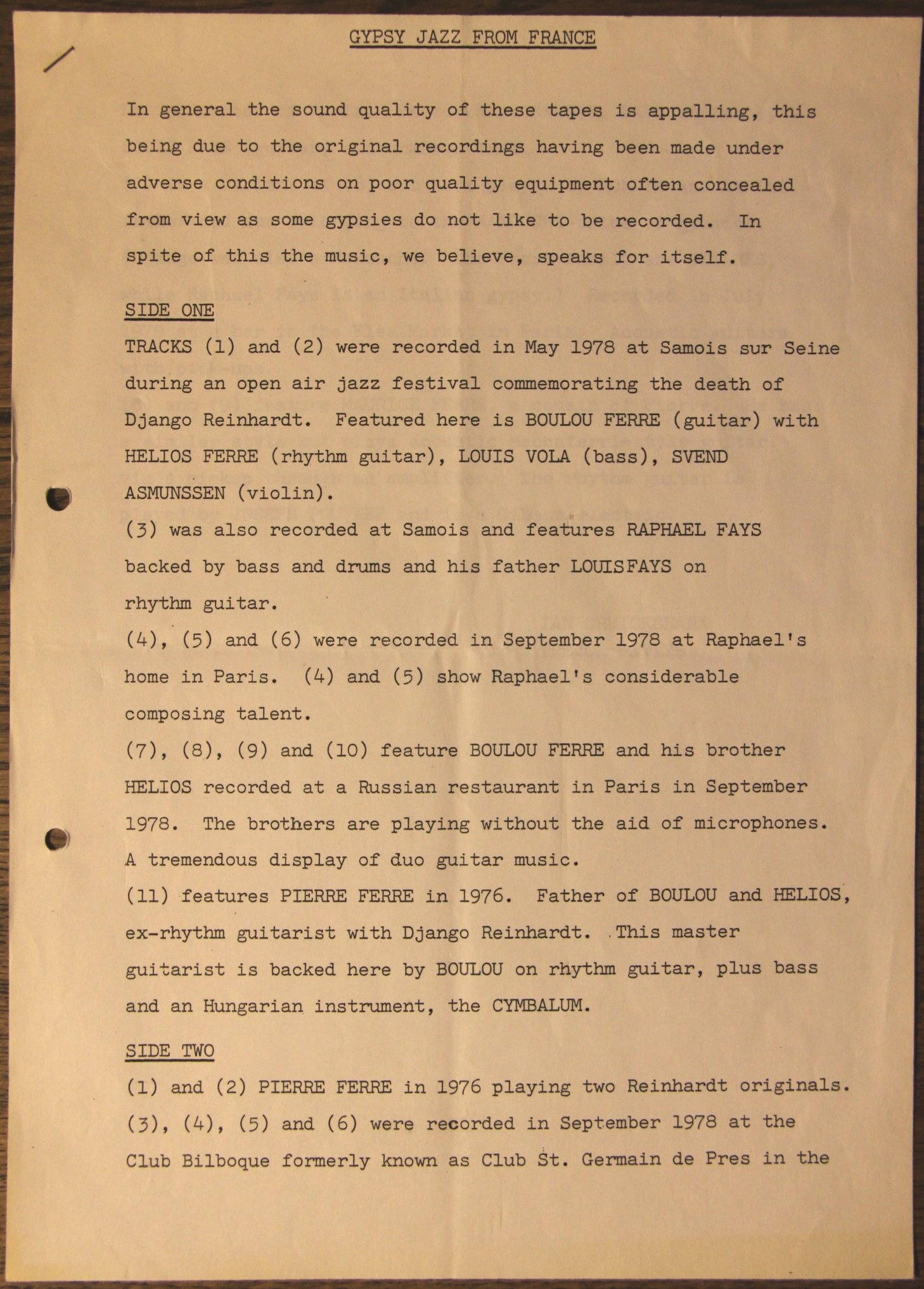 Here are scans of the materials included by Ian Cruickshank with his subscription-only cassette "Gypsy Jazz from France", circa 1982...