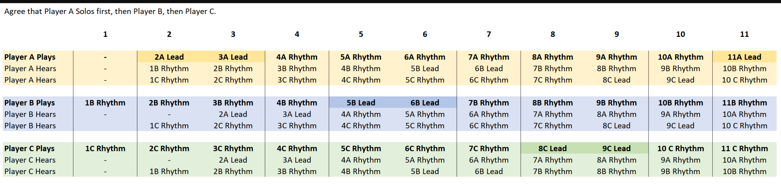 Then you jam. Not really sure how to explain it. It's very different from real jamming, and it's weird that you always hear the BPI interval that the other players played before. But it works for Gypsy Jazz because you agree who plays the solos when, and everybody else plays the same 32 bars of rhythm. From an individual player's perspective it works out [if everybody plays on time :) ]. Here is an image of my understanding of how it works: