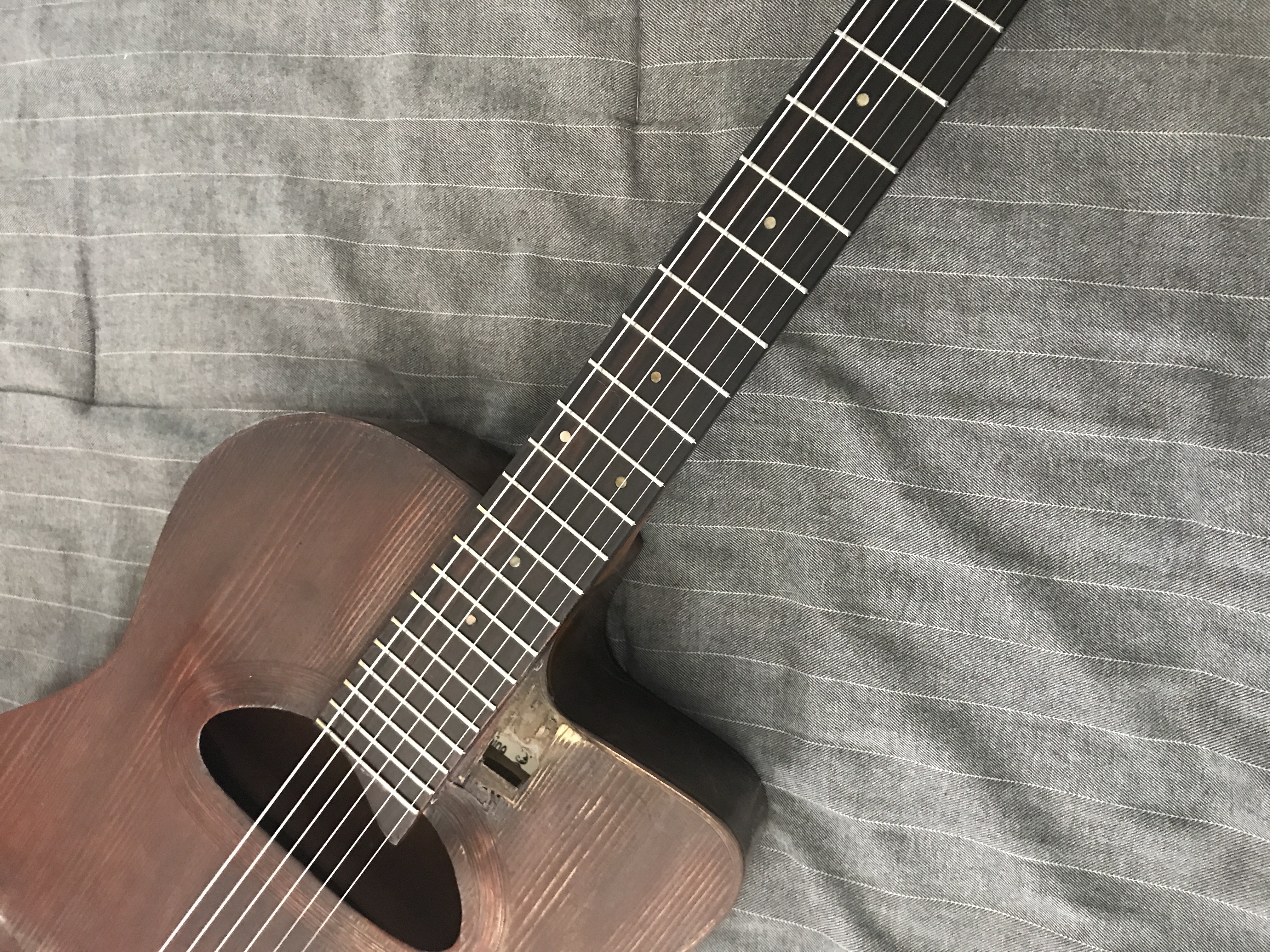 Hello all, new member of the forum community here. I recently acquired a Pierre Fontaine D-hole that is (very clearly) used. Despite all the physical/aesthetic issues with the instrument and the warping of the top, it still plays surprisingly well and delivers a very full tone. It is even supposedly signed by Frank Vignola on the back of the headstock (no way to confirm this, but I can't imagine why someone would fake his signature, especially on a Gypsy guitar). There is one issue with it: I have no clue what it is. I know it is a Pierre Fontaine model, but I have no clue of the age of the instrument or if there is any way to figure it out. I've researched his guitars and have not been able to find anything similar to the color of this one, and this leads me to believe it may have been re-stained which is a shame. The bridge doesn't appear to be original either as I can see the slight silhouette of a larger bridge that used to be above the new one. Likewise, the black tail-piece seems a bit odd as it is not the traditional brass. It has no truss rod (not sure if they are a standard feature on this type of guitar anyway). The fret board is 14 frets at the body, and it has a zero fret. Again, no clue if there is any way to figure out when this was made or if the top stain is original, but it has a lot of character and I quite like the roughness of it. It makes it seem a lot older than it probably is, but it's a welcome aesthetic. If anybody has any way of aiding me in figuring out when this guitar was made or the model, I would be very thankful. Thanks everybody!