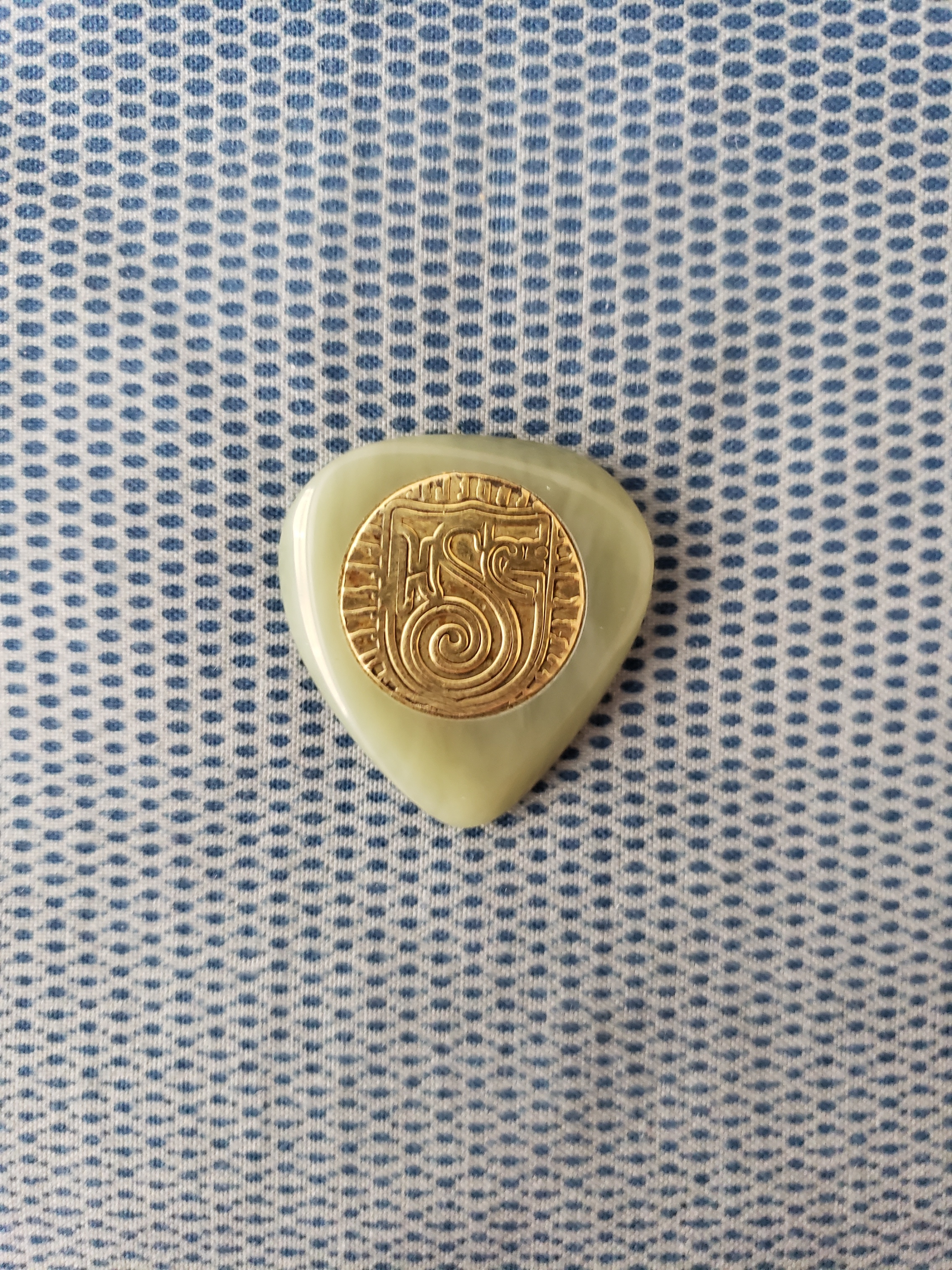 Killy G in jade. Beautiful pick, well made. For me, I can't play lines with it at all. The tip is so bulky and rounded all the way around that I have a difficult time effectively striking the string and resting on the next string with any speed at all. Just not for me. But, for rhythm, it is spectacular. Very deep and full sound. I can see how others might love this pick for everything. Maybe I have just spent too much time playing with the tear drop shape in thickness of 2mm or less which lets me play rest strokes very fast and accurately with maximum comfort. The other picks I use are more flat and they land on the next string flat which makes rest strokes much easier for me. Just my humble 2 cents.