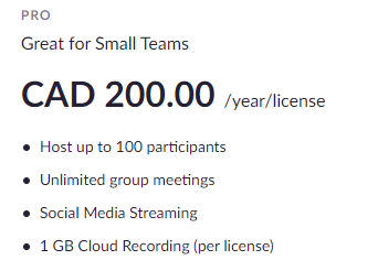 Zoom pro license is currently 150 USD, or 200 Canadian Dollars.