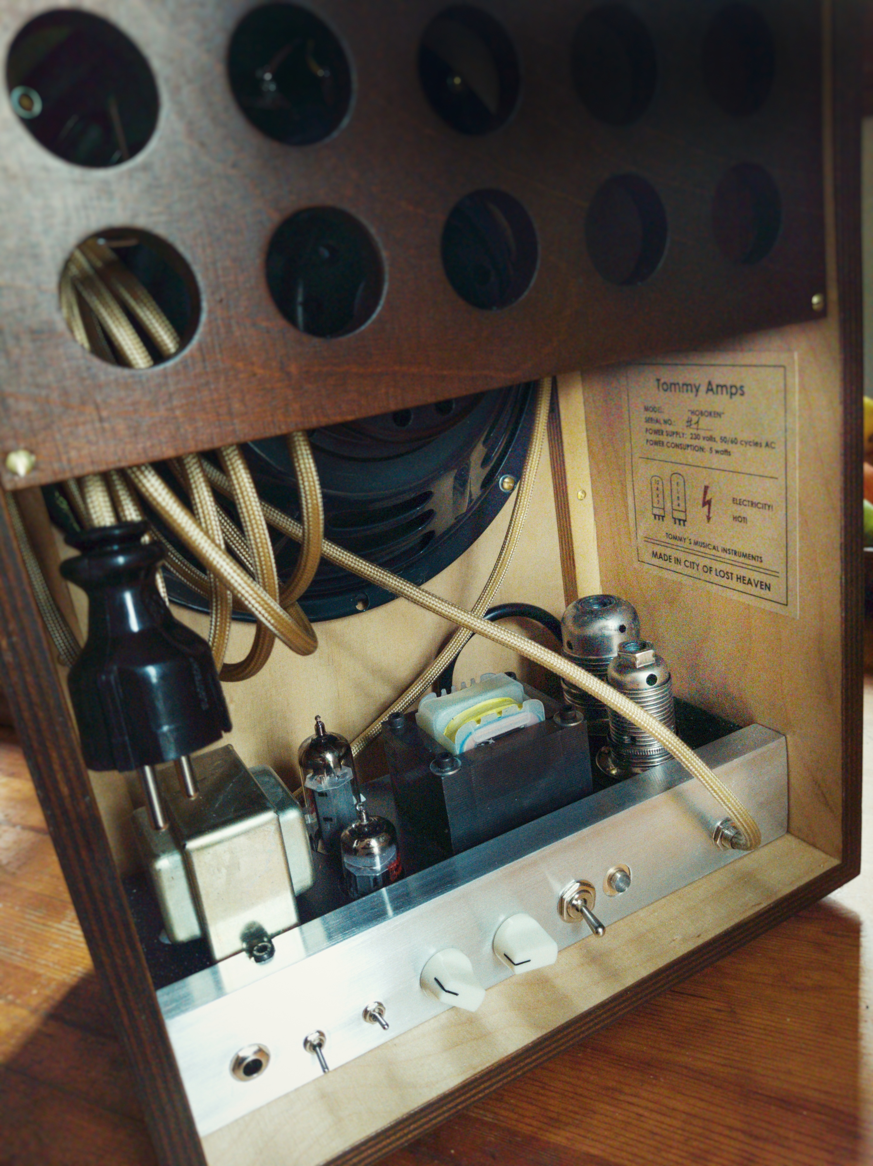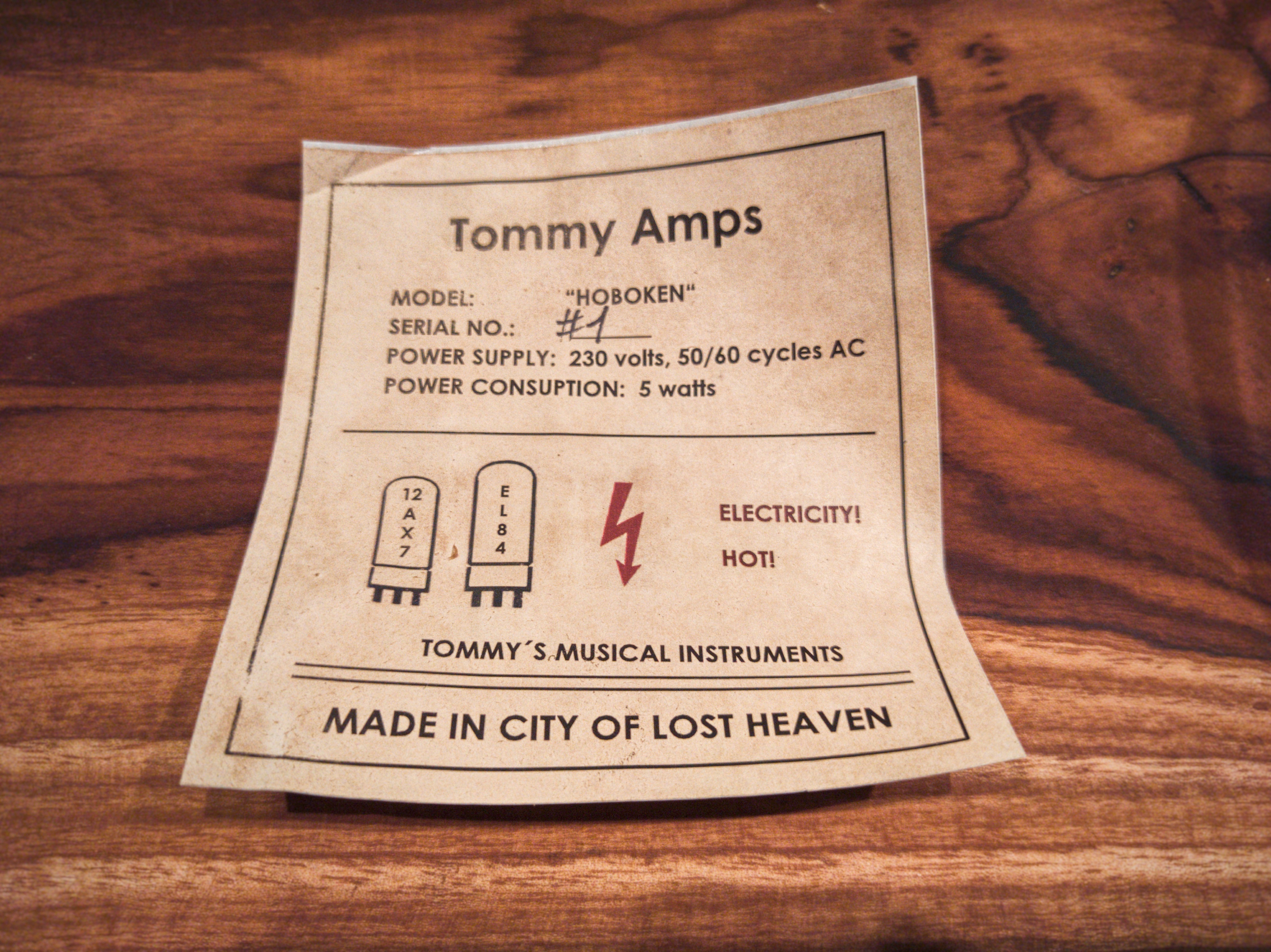 For fun I share a photo of my label that will be inside of the amp. Patina made by coffee. And to understanding... City of lost heaven is fictional city from Czech game I played when I was little called Mafia. It was similar to GTA but with much more atmosphere and music in radio when you drive old slow car was by Django. It was first time I've ever heard him...I love it. Everybody love it, but most people here in Czech know this music just like a music from this game...that's a pitty. And I'm Tom so Tommy Amp sounds little bit like Tommy gun, and Hoboken is part of the city. I don't like games much, but that game was something. My friend made it with few other people.