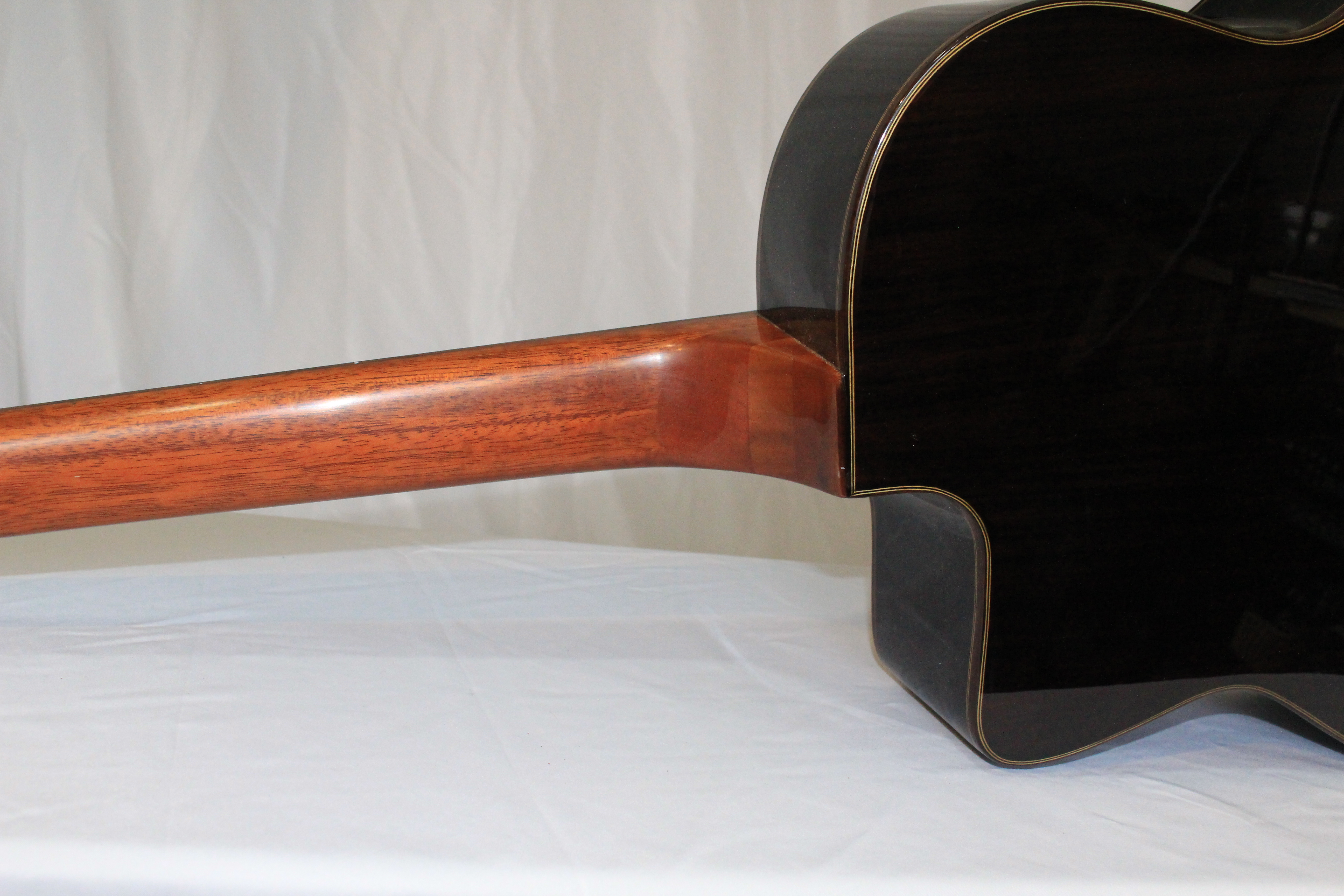 Spruce top, rosewood back and sides, Dell Arte upgrades the bridge, tailpiece and tuners. Plays well with action set just above 2.5mm on bass side and just below 2.5 on the treble. Price includes hardshell case.