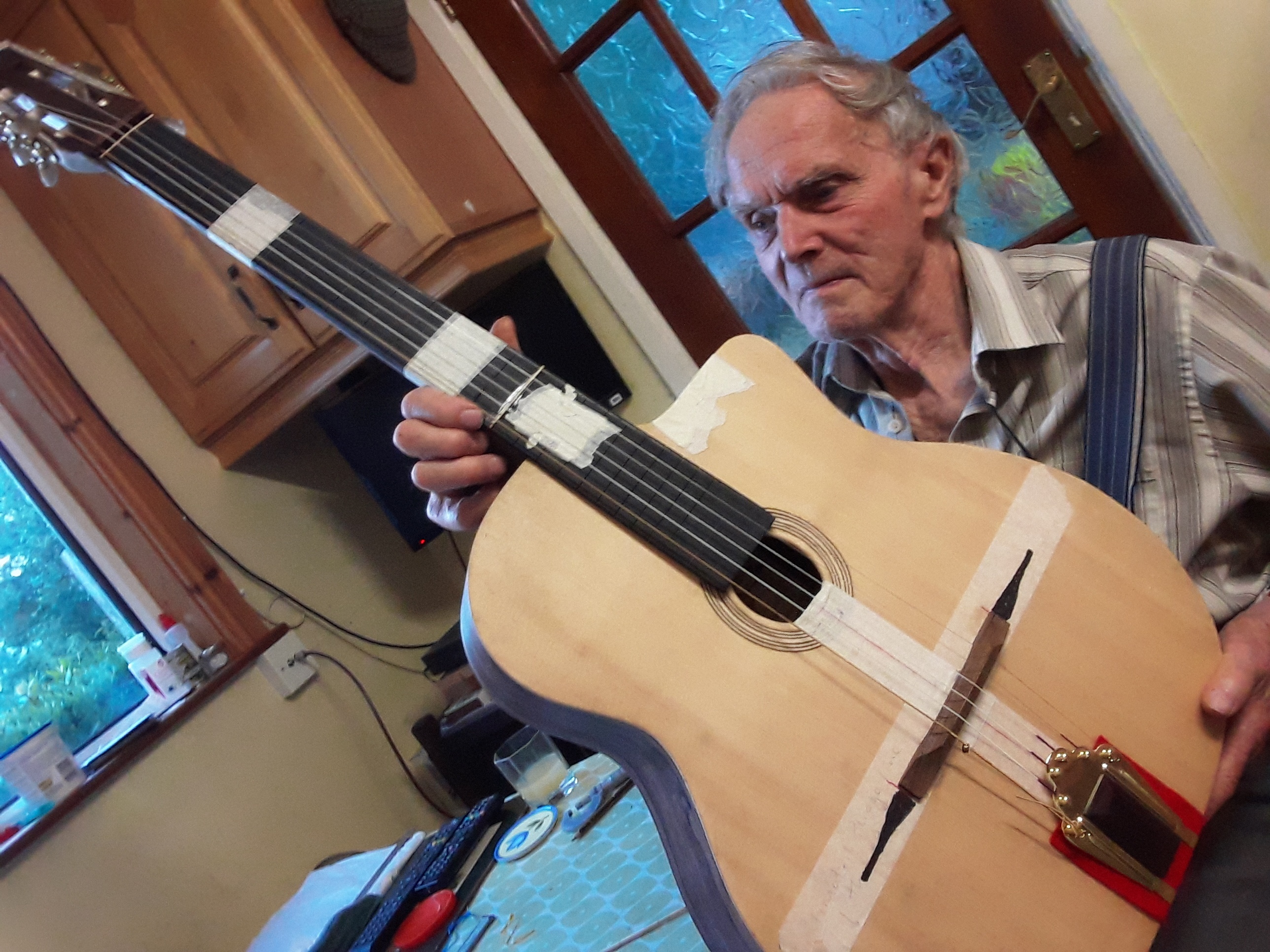 Anyway, that' pretty much how I do it. Not sure how the pros do it they probably have a fixture or something to support the body thru the soundhole but I never invested in one of those.