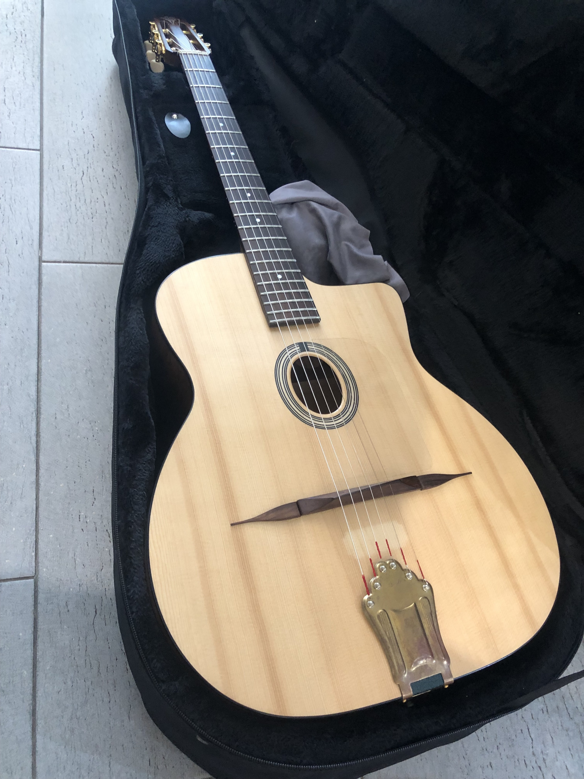 This Nomade has etimoé back and sides, French spruce top, mahogany neck, and a satin finish. The neck is bolted on and can be removed which is handy when traveling.
