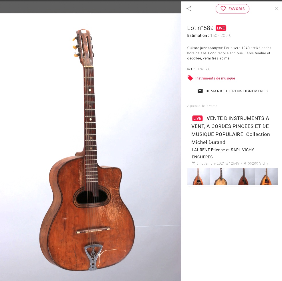 And yes, I agree the Sonoras shown above do appear to be more likely made in France than Sicily although yes, that tiny bit of decoration on the bridge (mine has the same as the one you posted) is typically Italian. I know of at least one other identical here in Australia too. Another question might be to identify the tuners, but again these are often changed down the years, the only clue being they are not always fitted with the typical yellow button Delaruelle tuners common to many Paris based luthiers.