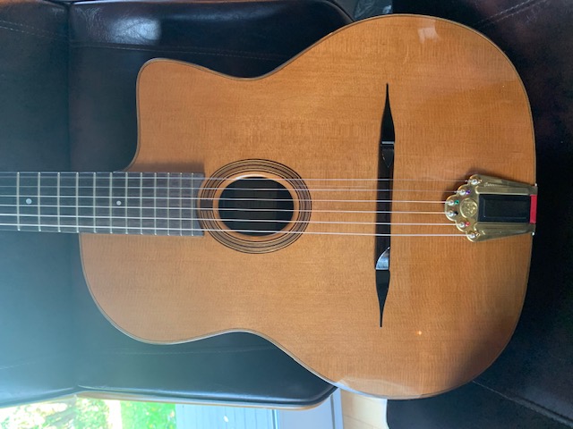 Selling my Bob Holo Cedar top nouveau. This is one of two that I own and has been a backup to my primary guitar. I've decided to sell it because no one deserves 2 Holos -especially when they play as poorly as I do. This is essentially brand new and mint. Has never been out of the house. Stored in a humidified case. Probably only on its 3rd set of strings.