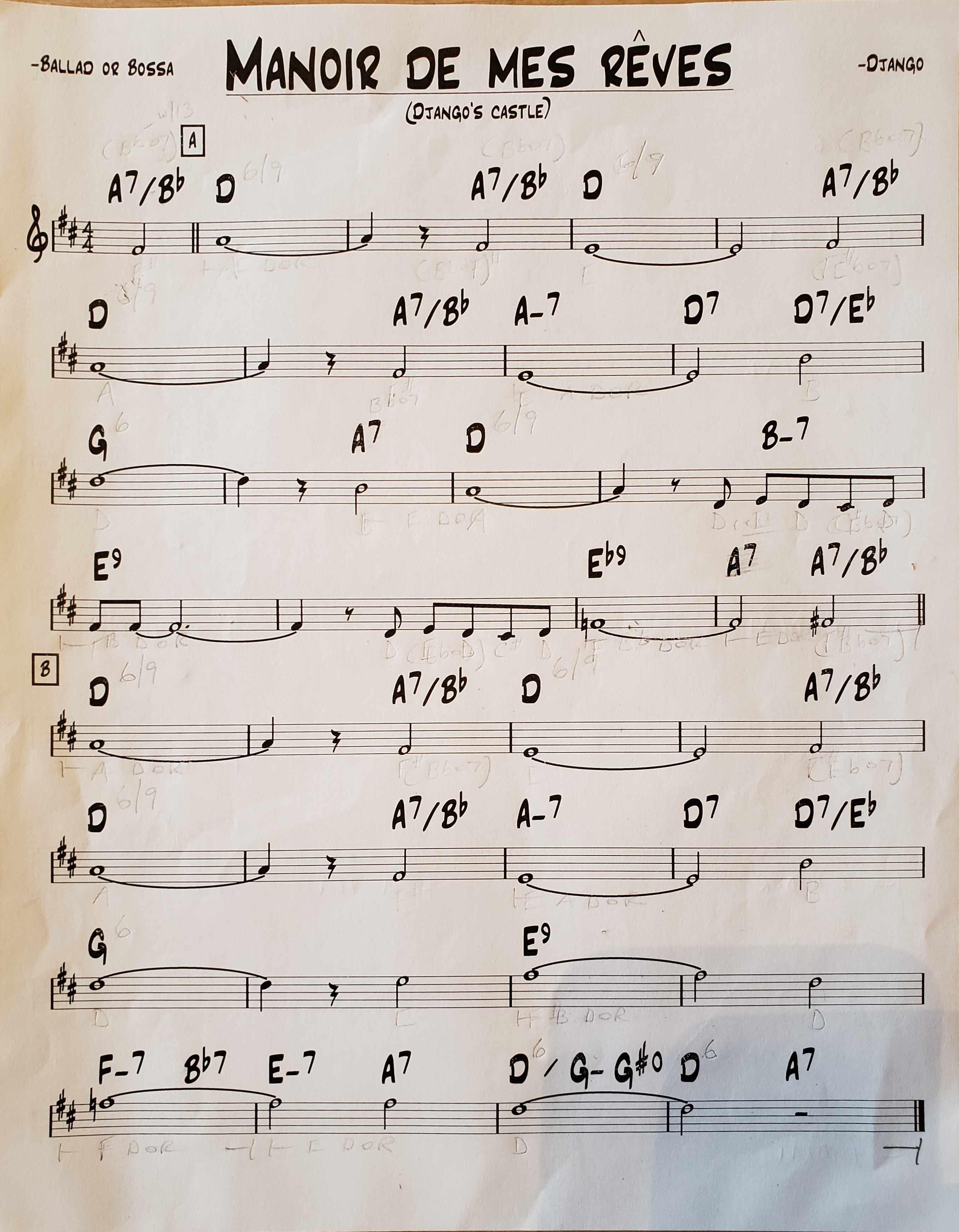 Django wrote this beautiful, haunting ballad (actually titled Manoir De Mes Reves) and first recorded it in 1943 in Paris with the Quintette du Hot Club de France. Evidently he composed this tune as a theme for a symphony he never finished. That's something I'm sure we would all love to hear, what a shame that it was never completed. Below is the chart commonly used. My trio plays it as a mid-tempo bossa, which is really fun. It's a great tune to call at jams; most folks know it & the head is quite simple. Classic Django, beautiful & imaginative.