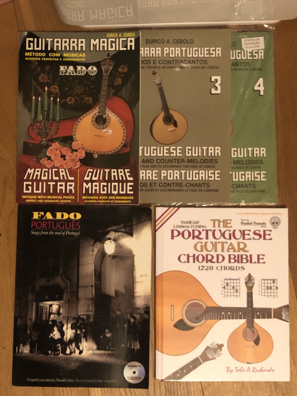 To be honest, I haven't played much guitarra Portuguesa in the last few months - it's been very much a "he also plays a bit of" instrument this year - but I do use "As Unhas" - the shaped plastic fingernails which attach under the real nail. There are a few method books I've picked up - mostly imported, along with strings, string winder, unhas, etc from online music shops based in Portugal: I definitely do recommend the Eurico A Cebolo series of books ...don't call him Eric Onion to his face :-) ... and they are tri-lingual, in French, Portuguese and English. The "Portuguese guitar chord bible" is not worth the new price (~£21), primarily because it's not kind of instrument where you're often playing big jazzy 13b5 chords across 6 (i.e. 12) strings. The "Fado Portugues" book might be more useful for repertoire with an aspiring vocalist, but doesn't get into guitarra technique.