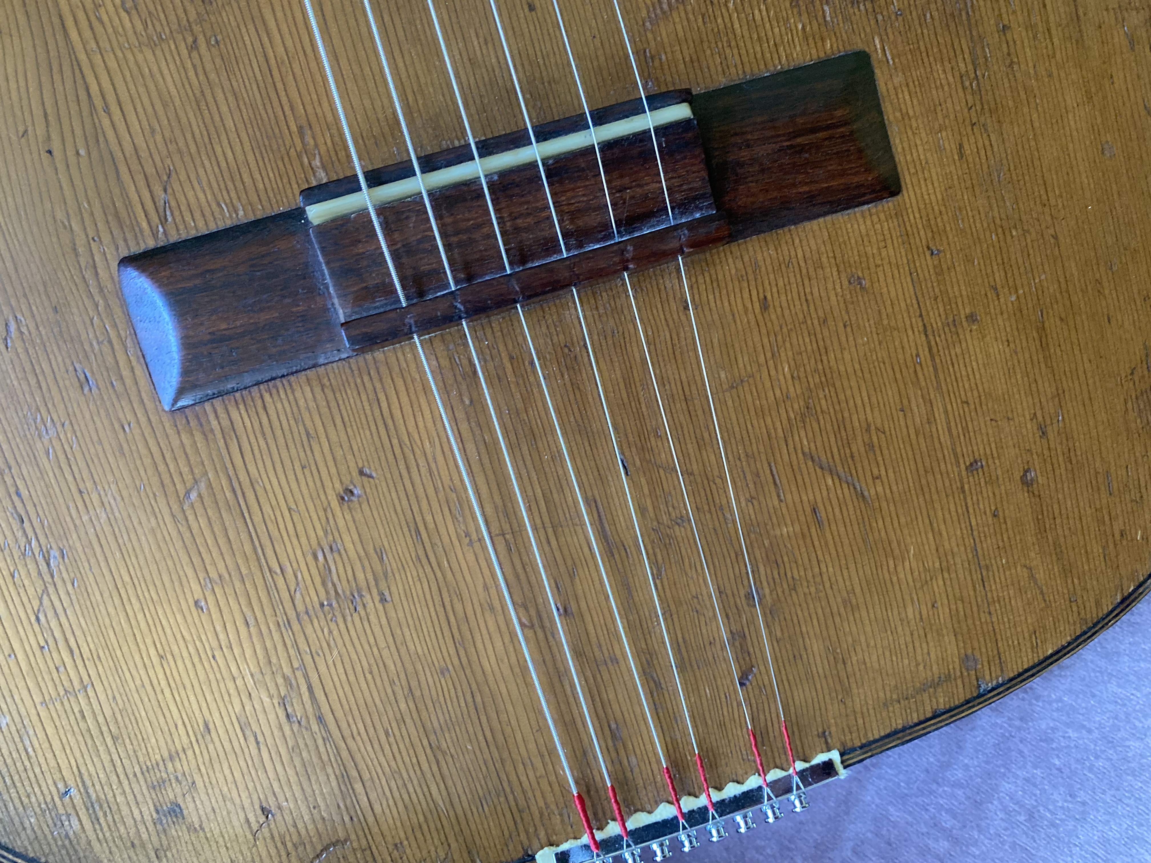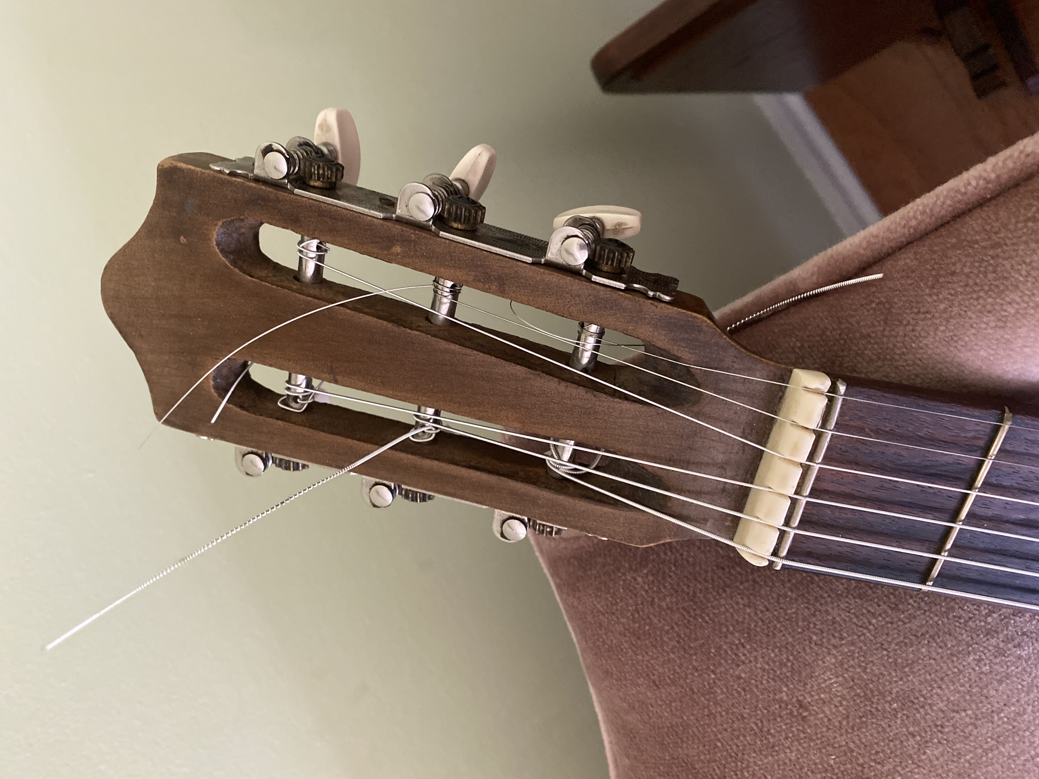 Bought it off ebay as a Jose Ramirez--it was clearly not, but looked interesting nonetheless. The guy had it strung with nylons and even had an ugly and obviously fake computer printed Ramirez label glued inside. I saw the outline of the original tailpiece so I hunted down the closest thing I could find: a made in china mandolin tailpiece of around the same size and shape. What are these mandolin-style end pieces called anyway? I see them on many Franco-Italian guitars.