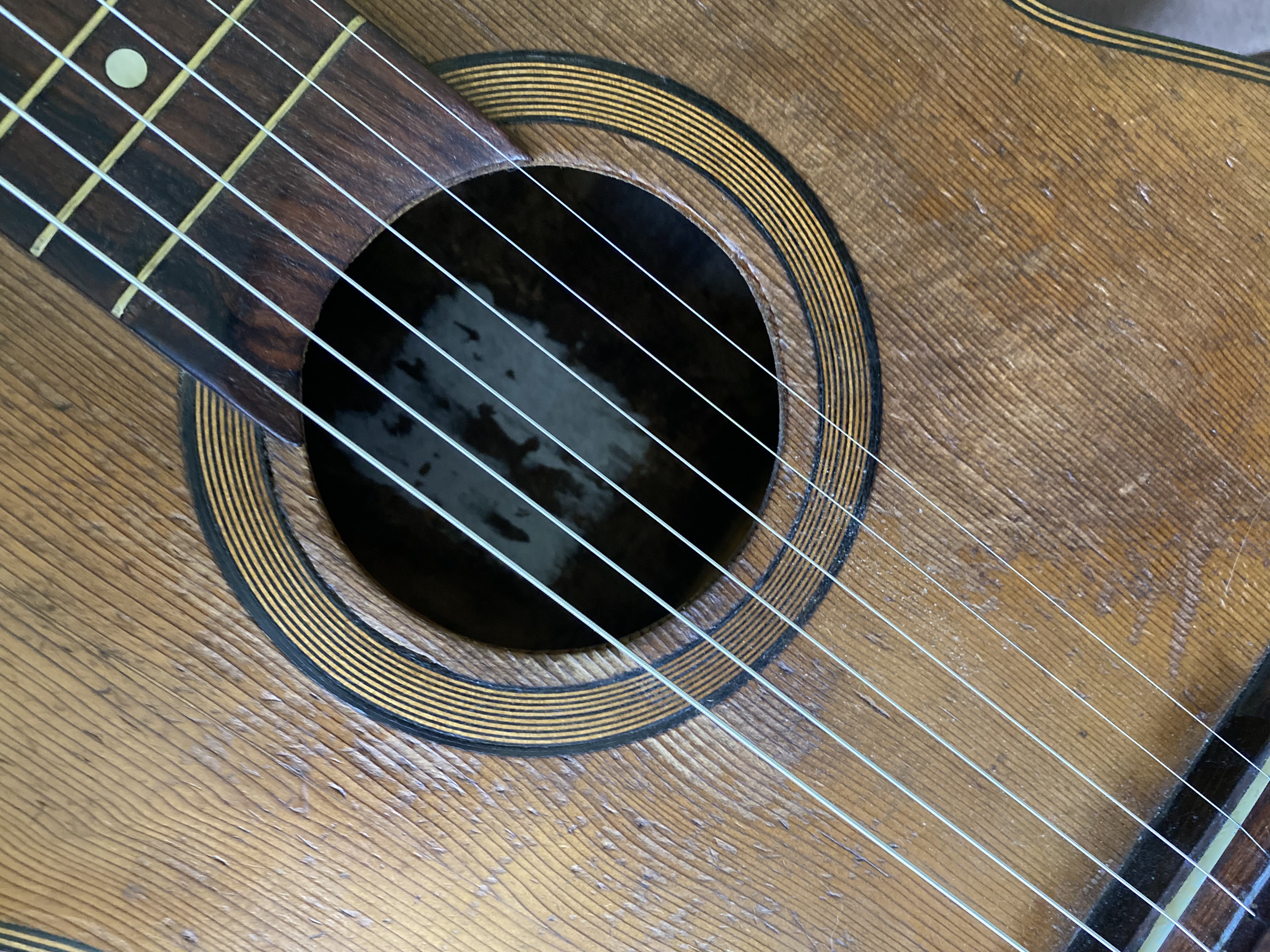 The seller was based out of Cremona, Italy, so I figured this thing has some connection with the early-century Franco-Italian thing. The vestigial classical style bridge reminds me of Spanish bandurrias and lauds, but I've seen the same thing in catalogues for "Spanish" type parlors from Di Mauro and similar builders. Still haven't found the maker responsible for this thing, though. Ladder braced. Laminate back and sides with a thicker three piece spruce (?) top that really packs a punch.