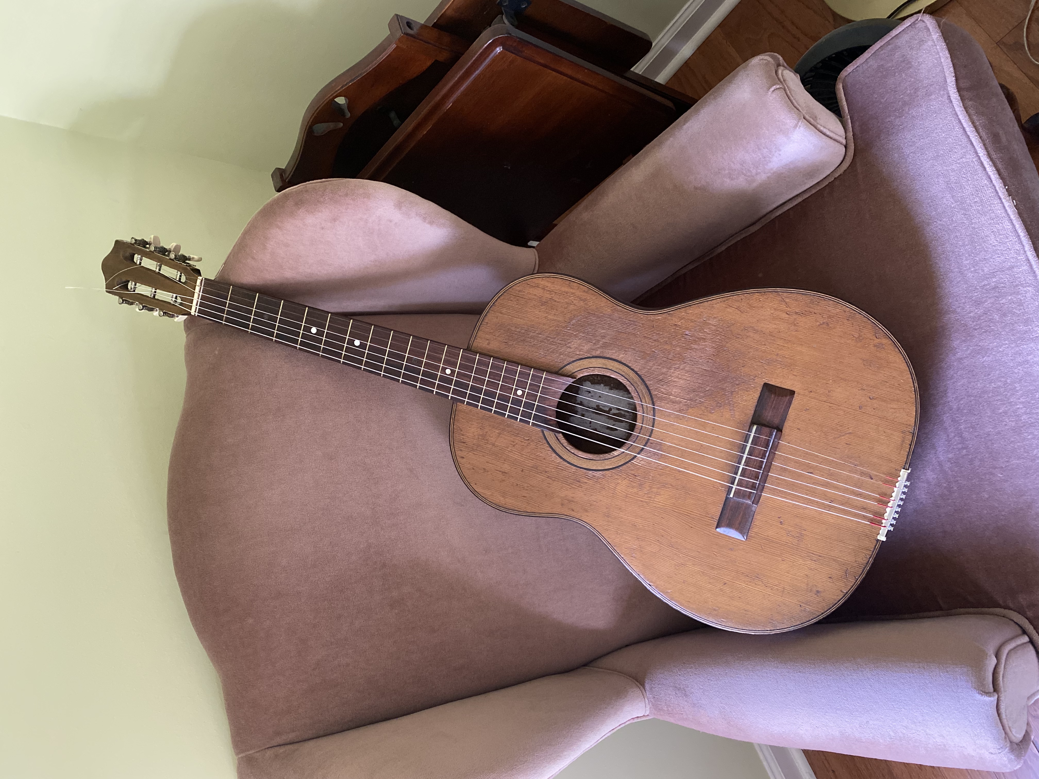 Bought it off ebay as a Jose Ramirez--it was clearly not, but looked interesting nonetheless. The guy had it strung with nylons and even had an ugly and obviously fake computer printed Ramirez label glued inside. I saw the outline of the original tailpiece so I hunted down the closest thing I could find: a made in china mandolin tailpiece of around the same size and shape. What are these mandolin-style end pieces called anyway? I see them on many Franco-Italian guitars.