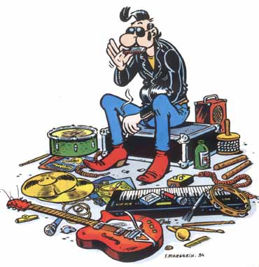 Another french Illustrator with much music in his work is Frank Margerin, born 1952. While Sempé's drawings show a more conservative urban scene with people playing piano, violin and other orchestral instruments, Margerin's staff consists of suburban punk and rock'n'roll addicts: