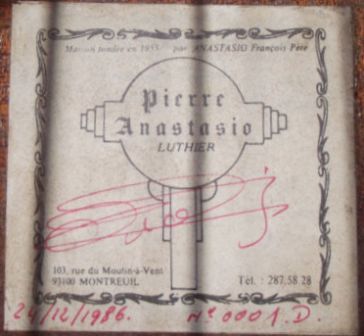I swapped this guitar for another one which didn't suit me and to be honest it was an odd guitar. Typical gypsy body but with a Les Paul type neck and headstock - although it was a 670mm scale length. Over the years I worked on the guitar until it basically fell apart. However I feel as though it's worth resurrecting. The photographs show the guitar as I received it and it always struck me as an odd guitar for Anastasio to build. When I was working on the guitar I varnished the label and - like secret writing - another message appeared behind the label which is visible in the attached picture. After a bit of work I found that the label had been added over a previous one and it read " Guitare construite specialment pour mon ami Guy Reboul" Both labels have the same date of manufacture and the same model number - 24/12/86 0001D.