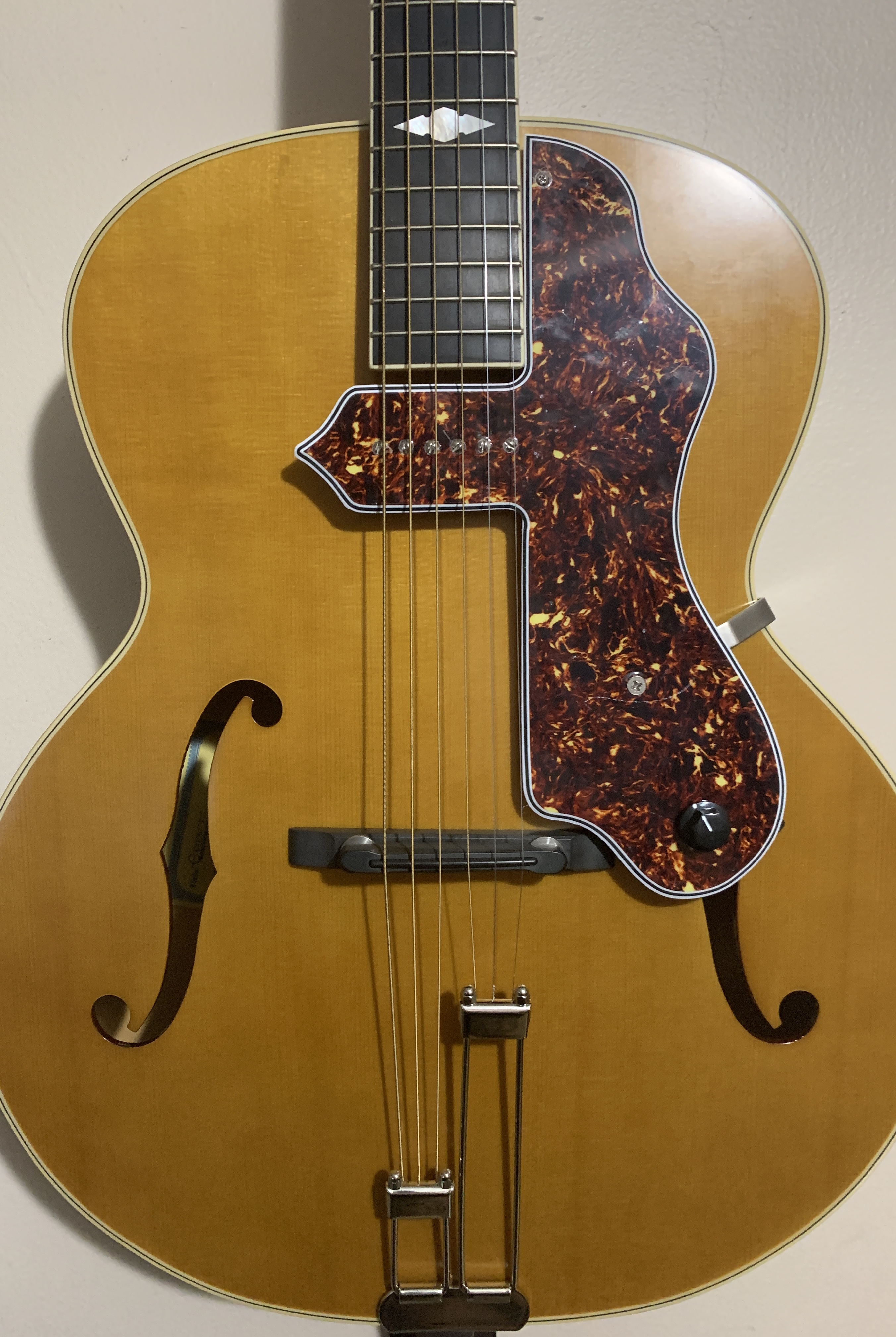 This guitar is a superb playing and sounding arch top with an added pickup built in to a McCarty style pick guard. It also has a bridge pickup with a separate output jack that I rarely use, It has an after market Frequensator style tailpiece, but the original will be in the hardshell case.