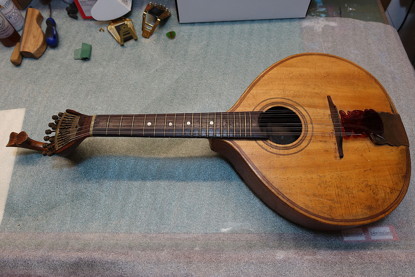 Judging by the shape of the headstock, I *think* Jamie's guitarra is the least common of the three main sub-types, the "Porto" model. Like many vintage guitarras (like my Lisboa-style Abílio Godinho), it seems smaller bodied than modern instruments.