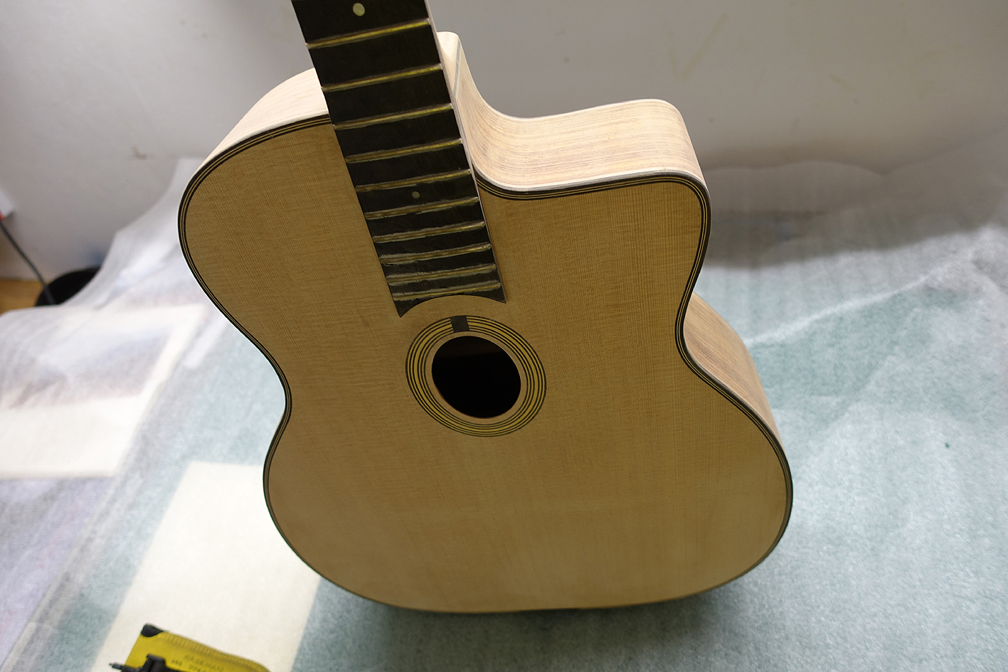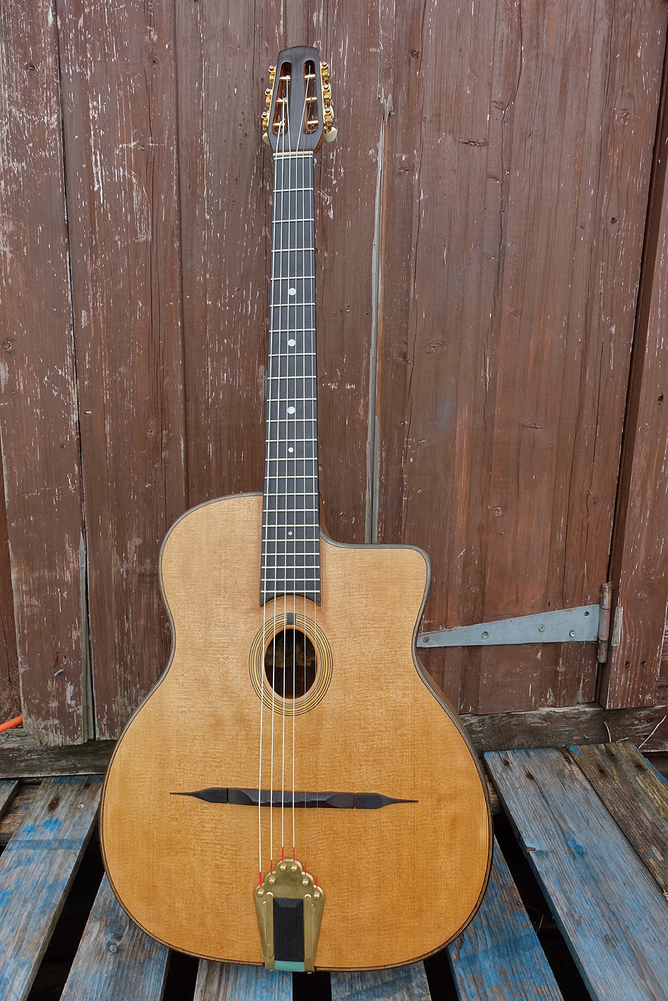 I wasn't looking to buy another guitar, but a nice looking Gitane 255 was on Gumtree for a low price and the interesting grain of the spruce top caught my attention. I took all the finish off the entire guitar, right back to bare wood. I've lightly shellac-ed the guitar, narrowed and chamfered the fingerboard a little and added a Gallato tailpiece and Altamira tuners. The result is definitely different - some of that brash brightness has gone, and the guitar feels more resonant. I'm sure it's noticeably lighter in weight now! I'll wait for the new strings to settle down a bit before making a recording. I took it to the monthly gypsy jazz jam session at Glenuig Inn yesterday, and I think it sounded pretty good.