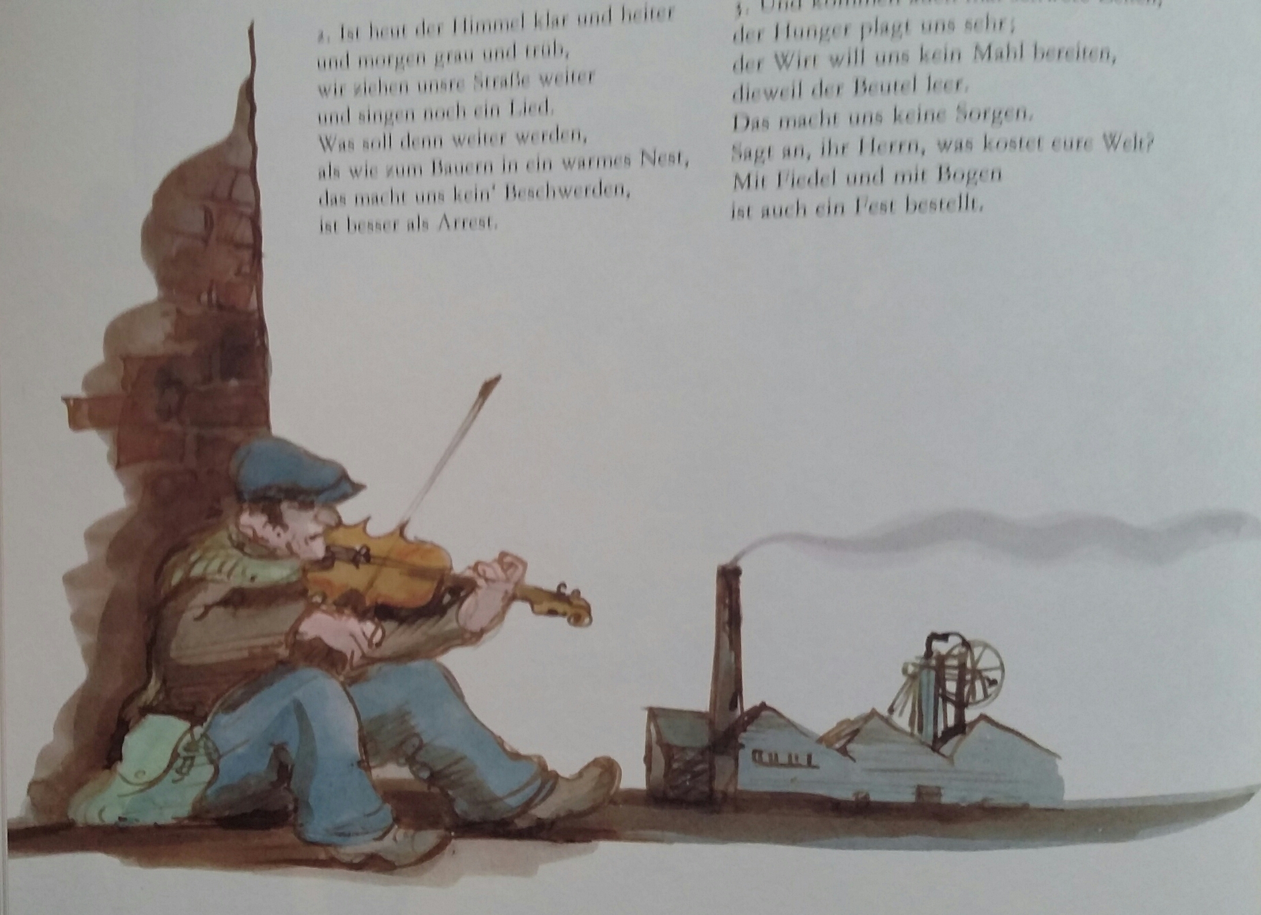 And I appreciate that as an illustrator he dares to go against the lyrics as shown by the fiddler with the factory in the background ("Hans Spielmann stimme deine Fiedel") or the gypsy guitar player and the caravan ("Lustig ist das Zigeunerleben") above.