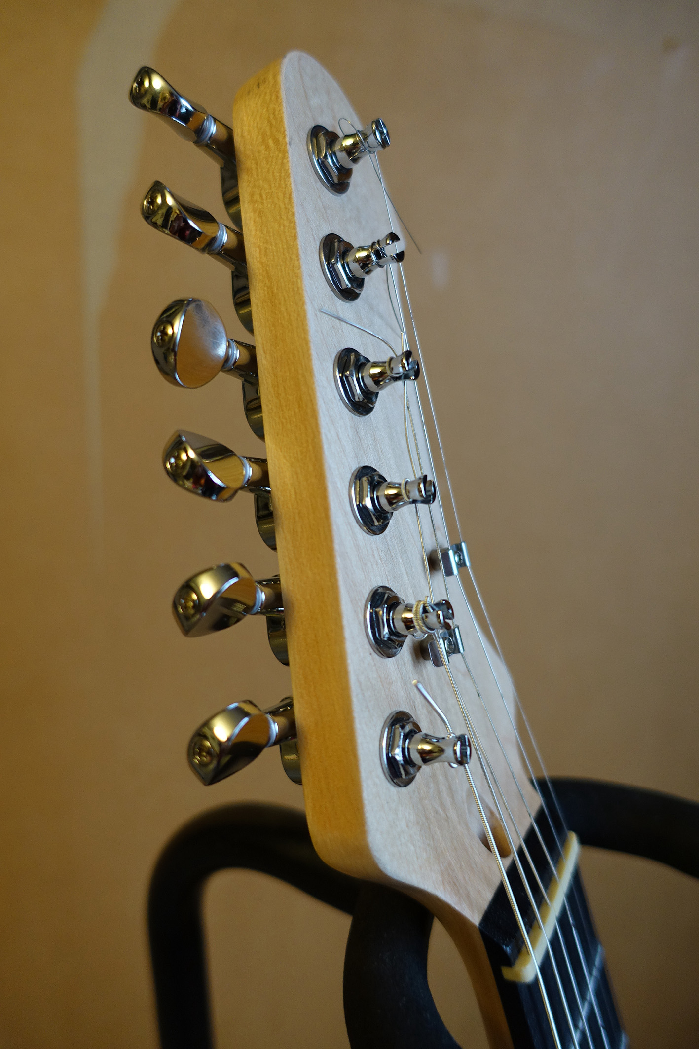 Thanks for the suggestions!!! I've been out in the hills today so not managed to play it/tweak it/photograph it etc yet. Hopefully tomorrow. You're right Jason, I need to be tuning it up a fifth I reckon. The strings are coming off and I'm going to file the frets down a bit. They're very high at the mo. The other issue is that the tuning machines are horrible!! - the strings don't go through holes but just rest in slots - is that common on electric guitars? I will be looking for some replacements (or might poach my Peavey Predator electric machine heads).