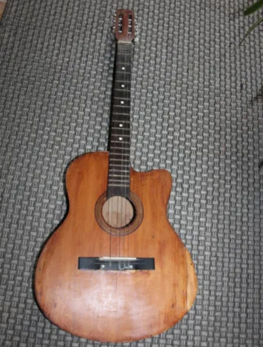 Hi Elienu, I have seen that guitar as well, I have no idea... . Difficult to tell who made this guitar.. . But I have a non-cutaway gypsy guitar with exactly the same bindings that also has a similar three piece neck. There is a Symphonia label in mine, but Symphonia was only a reseller. The top is quite "bombé". It still needs to be restored.