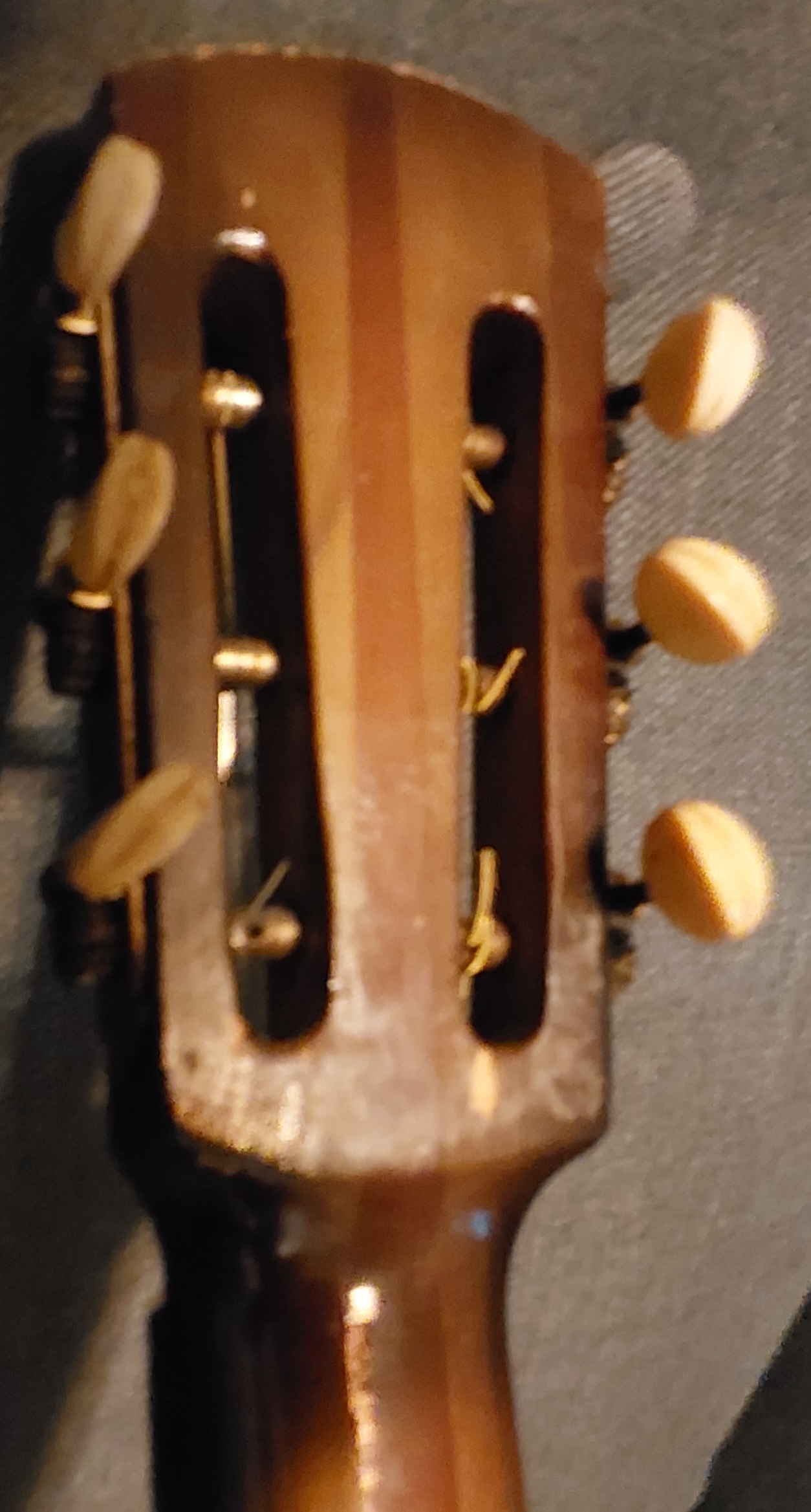 Unusual headstock for an old "jazzbox". No arched top nor back. Ladder bracing. There must have been a pickup: screw holes at the sides of the fretboard - not floating, but glued to the top just like with manouche guitars. No signs for a pickguard. The two marks by the right cat's eye seem to show the position of control knobs.
