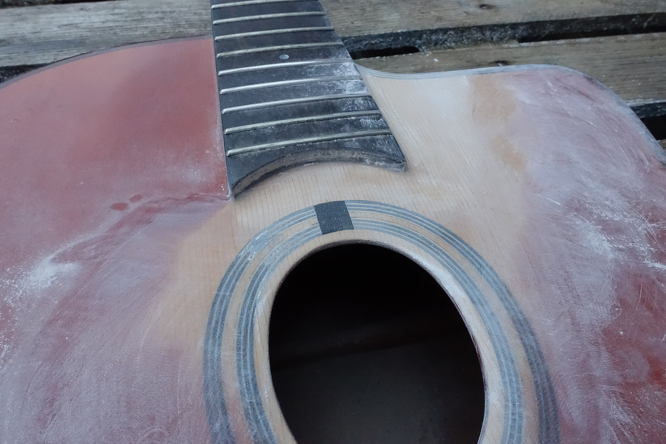 Ok, managed to get the whole thing back to bare wood. Wow, what a ludicrous amount of lacquer!!! Much more than both Gitane 255s which I have worked on previously. I now have to decide whether to 'distress' the guitar, or something else. I'm tempted with the aged vintage look. Killy Nonis is making me a Selmer tailpiece which I can age with cold patination fluid. The original JWC tuners already look a bit old, but I could age them as well.