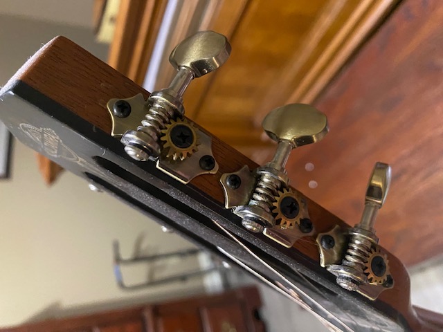 The tuners are upgraded. Riser behind the nut re-glued. Comes with a classy hard case. Not much play time at all.