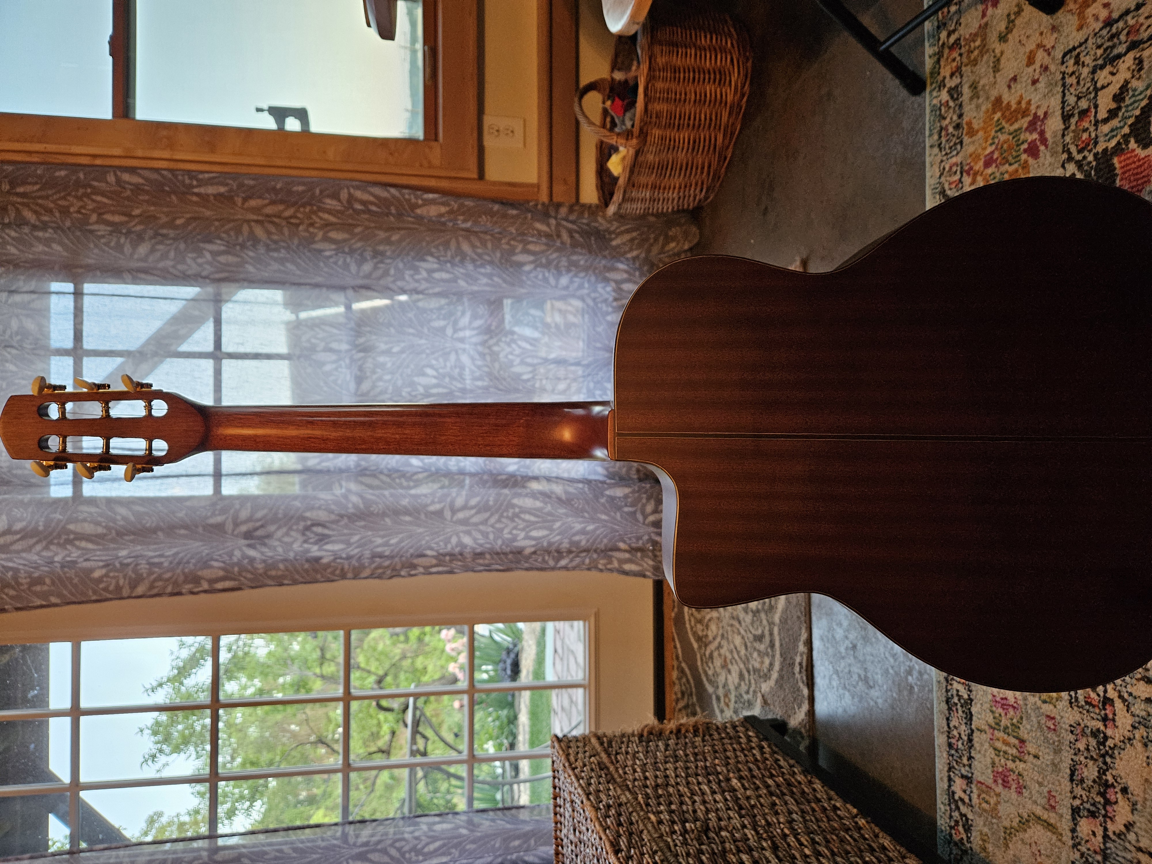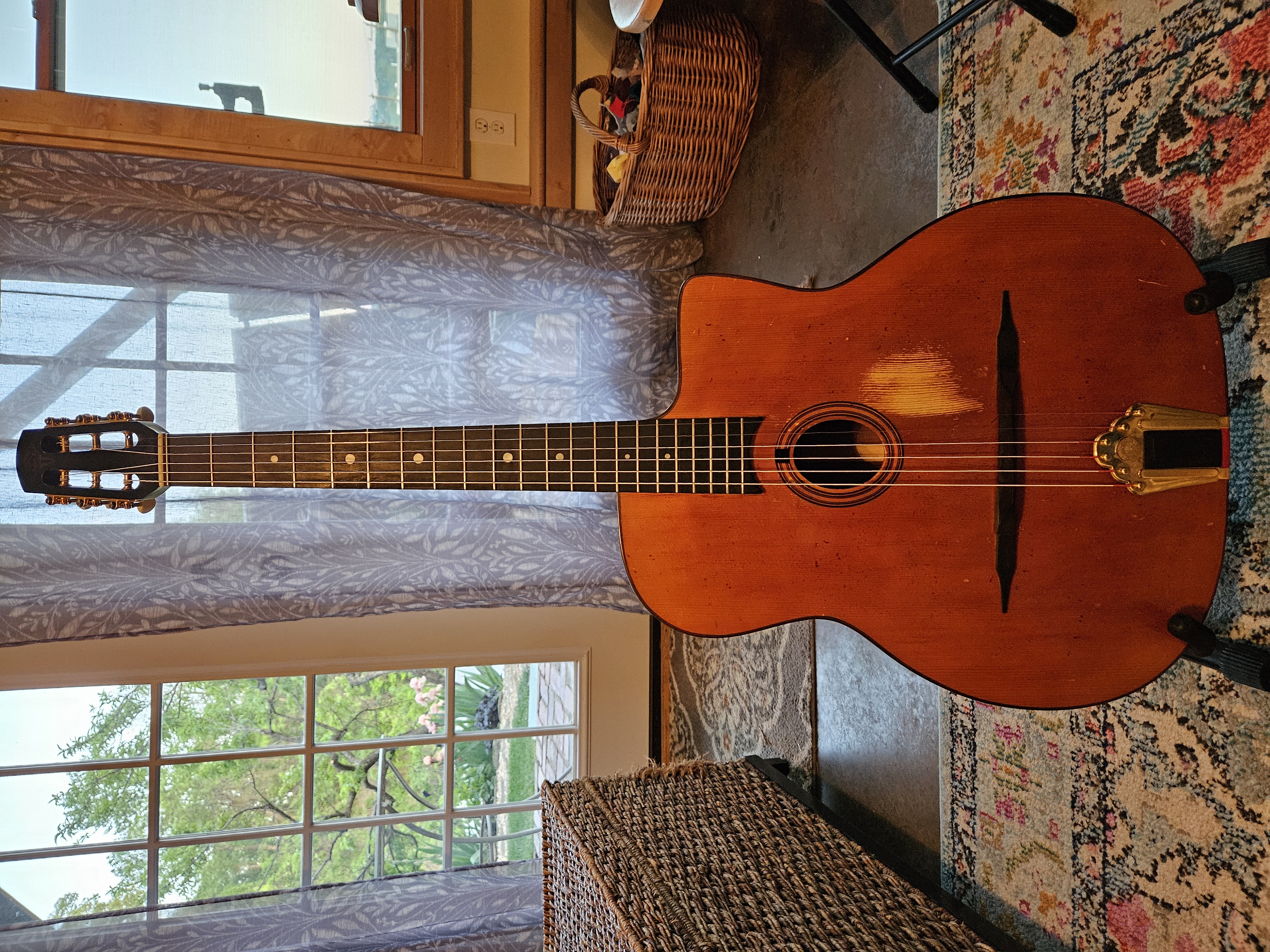 I cant believe I'm doing it but I'm selling my workhorse Altamira after 500+ gigs on it. I play mostly rhythm these days and prefer the "broader rhythm sound" of my Altamira D-hole for that. And those that know me know that I cant stand having a guitar around that isn't being regularly played. The M-10 is a fine guitar, recently set up by my luthier in Asheville. It has the usual minor wear of a workhorse + a lot of pick wear of the antique finish from a million la pompe chunkings (see pics). $1000 + $100 shipping to the lower 48. Plays, looks & sounds great. I play my guitars a lot but take really good care of them. Spruce top, mahogany back & sides, Superior hardshell case.